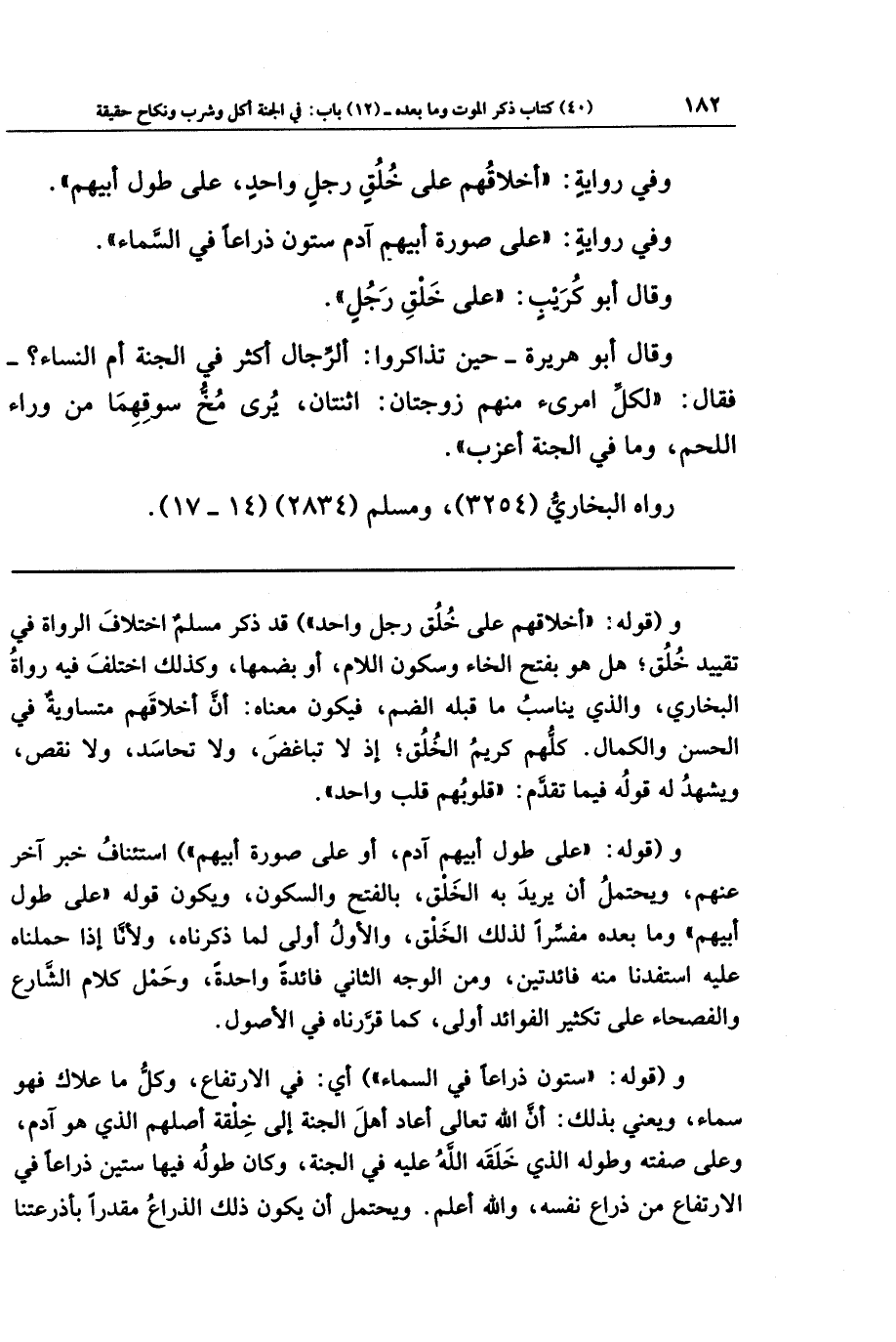 و(قوله: ستون ذراعا في السماء) أي: في الارتفاع، وكل ما علاك فهو سماء، ويعني بذلك: أن الله تعالى أعاد أهل الجنة إلى خلقة أصلهم الذي هو آدم، وعلى صفته وطوله الذي خلقه الله عليه في الجنة، وكان طوله فيها ستين ذراعا في الارتفاع، من ذراع نفسه، والله أعلم. ويحتمل أن يكون ذلك الذراع مقدرا بأذرعتنا