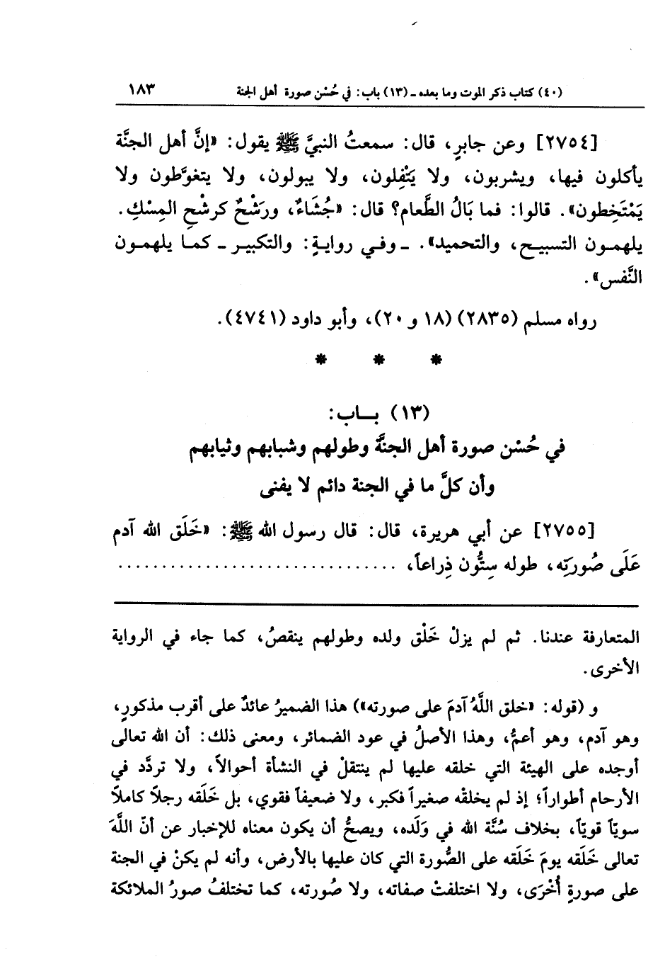 (13) باب في حسن صورة أهل الجنة وطولهم وشبابهم وثيابهم وأن كل ما في الجنة دائم لا يفنى