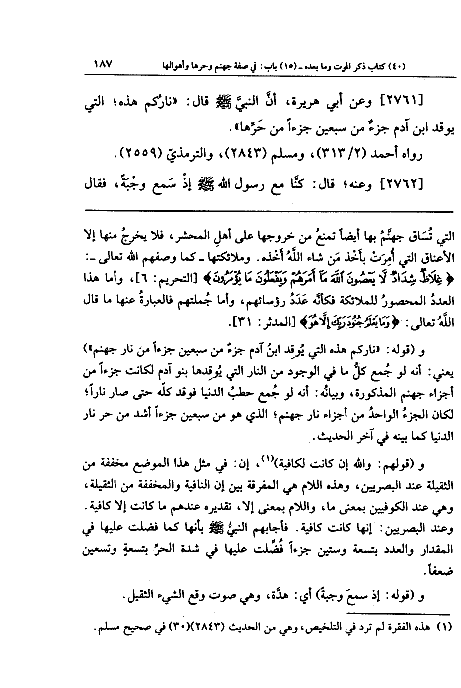 [2761] وعن أبي هريرة أن النبي صلى الله عليه وسلم قال: ناركم هذه التي يوقد ابن آدم جزء من سبعين جزءا من حرها.