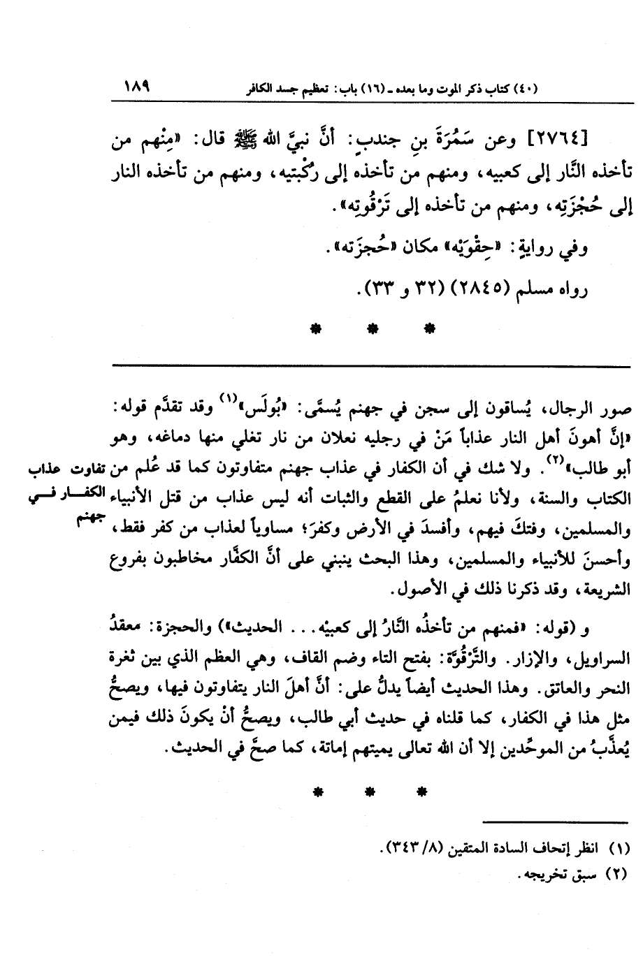 و(قوله: فمنهم من تأخذه النار إلى كعبيه. . . الحديث) والحجزة: معقد السراويل والإزار. والترقوة، بفتح التاء وضم القاف، وهي العظم الذي بين ثغرة النحر والعاتق. وهذا الحديث أيضًا يدلّ على أن أهل النار يتفاوتون فيها، ويصح مثل هذا في الكفار، كما قلناه في حديث أبي طالب، ويصح أن يكون ذلك فيمن يعذب من الموحدين، إلا أن الله تعالى يميتهم إماتة، كما صح في الحديث.