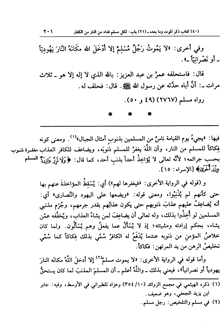 فيها: يجيء يوم القيامة ناس من المسلمين بذنوب أمثال الجبال (¬1). ومعنى كونه فكاكا للمسلم من النار، وأن الله يغفر للمسلم ذنوبه، ويضاعف للكافر العذاب بحسب جرائمه؛ لأنَّه تعالى لا يؤاخذ أحدا بذنب أحد، كما قال: {وَلا تَزِرُ وَازِرَةٌ وِزرَ أُخرَى}