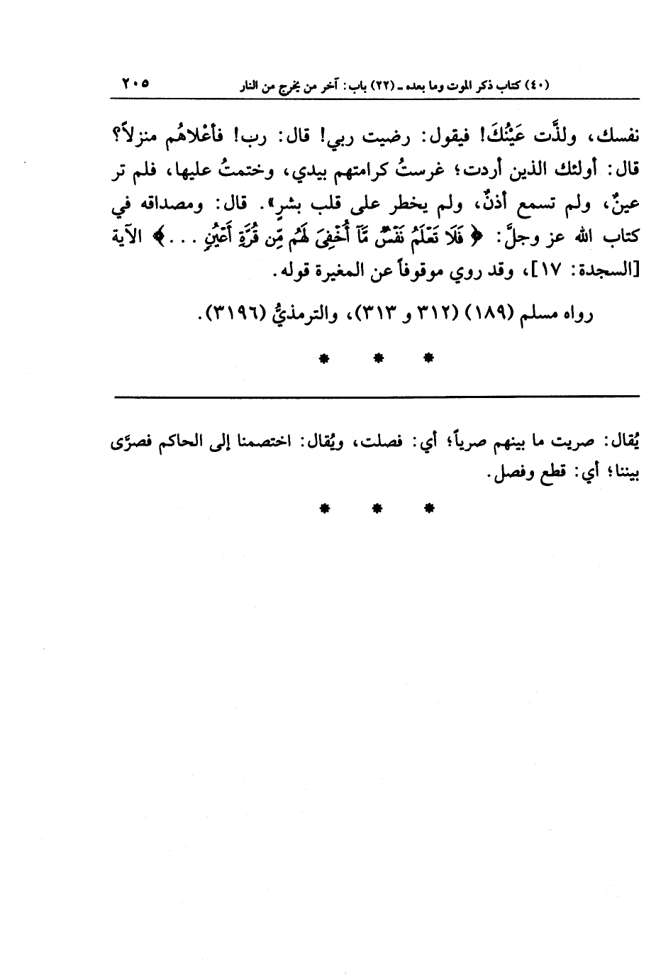 نَفسُكَ، وَلَذَّت عَينُكَ، فَيَقُولُ: رَضِيتُ رَبِّي، قَالَ: رَبِّ فَأَعلَاهُم مَنزِلا؟ قَالَ: أُولَئِكَ الَّذِينَ أَرَدتُ، غَرَستُ كَرَامَتَهُم بِيَدِي، وَخَتَمتُ عَلَيهَا، فَلَم تَرَ عَينٌ، وَلَم تَسمَع أُذُنٌ، وَلَم يَخطُر عَلَى قَلبِ بَشَرٍ، قَالَ: وَمِصدَاقُهُ فِي كِتَابِ اللَّهِ عَزَّ وَجَلَّ: {فَلا تَعلَمُ نَفسٌ مَا أُخفِيَ لَهُم مِن قُرَّةِ أَعيُنٍ} الآيَةَ. وقد روي موقوفا عن المغيرة قوله.