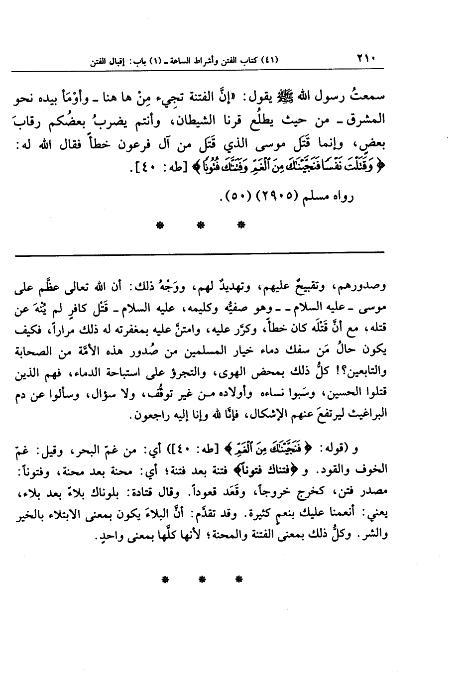 وصدورهم، وتقبيح عليهم، وتهديد لهم، ووجه ذلك: أن الله تعالى عظم على موسى - عليه السلام - وهو صفيه وكليمه، عليه السلام - قتل كافر لم يُنه عن قتله، مع أن قتله كان خطأ، وكرر عليه، وامتن عليه بمغفرته له ذلك مرارا، فكيف يكون حال من سفك دماء خيار المسلمين من صدور هذه الأمة من الصحابة والتابعين؟ ! كل ذلك بمحض الهوى، والتجرؤ على استباحة الدماء، فهم الذين قتلوا الحسين، وسبوا نساءه وأولاده من غير توقف ولا سؤال، وسألوا عن دم البراغيث ليرتفع عنهم الإشكال، فإنا لله وإنا إليه راجعون.