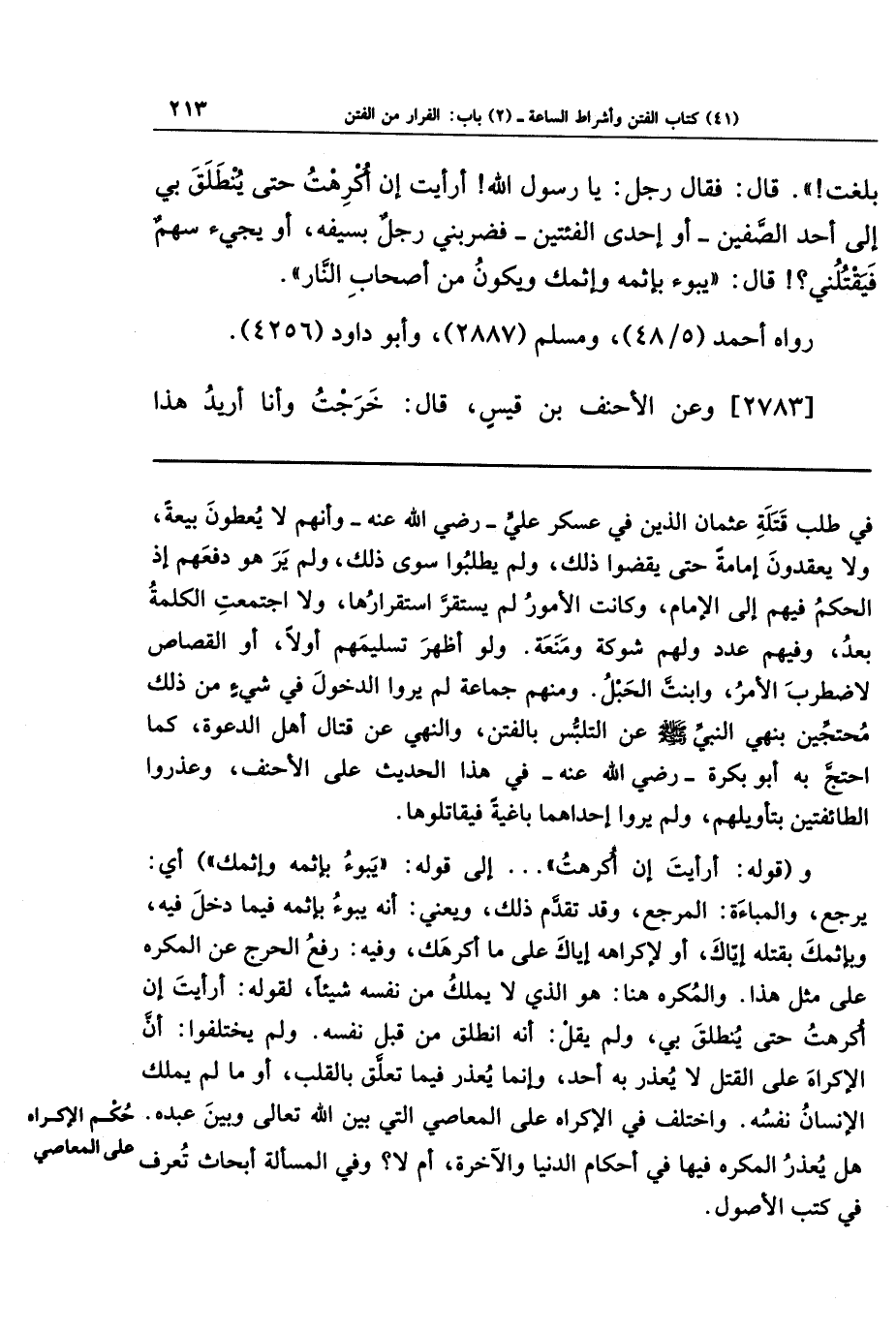 بَلَّغتُ؟ قَالَ: فَقَالَ رَجُلٌ: يَا رَسُولَ اللَّهِ أَرَأَيتَ إِن أُكرِهتُ حَتَّى يُنطَلَقَ بِي إِلَى أَحَدِ الصَّفَّينِ - أَو: إِحدَى الفِئَتَينِ - فَضَرَبَنِي رَجُلٌ بِسَيفِهِ، أَو يَجِيءُ سَهمٌ فَيَقتُلُنِي؟ قَالَ: يَبُوءُ بِإِثمِهِ وَإِثمِكَ وَيَكُونُ مِن أَصحَابِ النَّارِ.