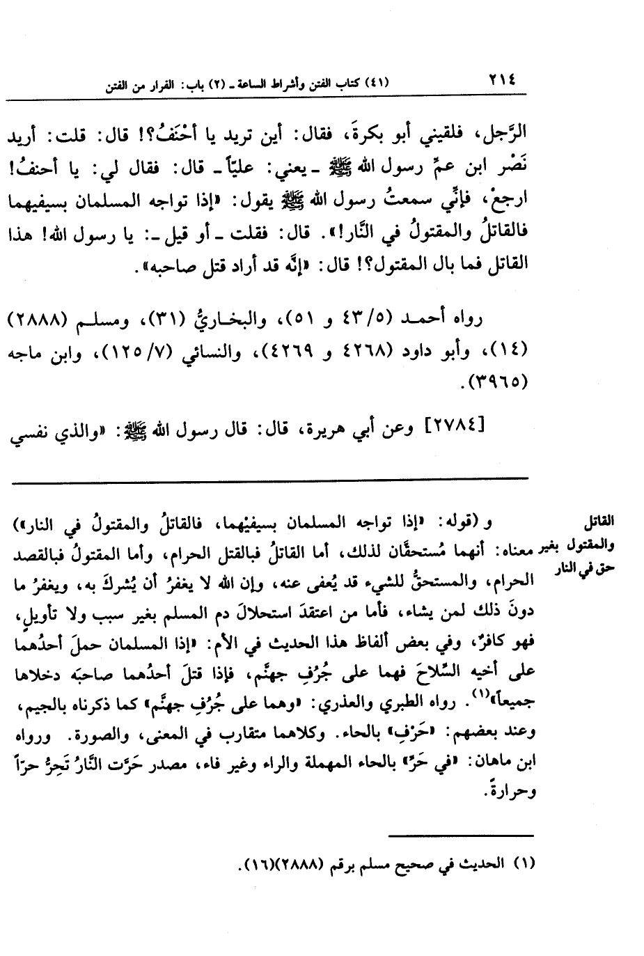 الرَّجُلَ، فَلَقِيَنِي أَبُو بَكرَةَ فَقَالَ: أَينَ تُرِيدُ يَا أَحنَفُ؟ قَالَ: قُلتُ: أُرِيدُ نَصرَ ابنِ عَمِّ رَسُولِ اللَّهِ صَلَّى اللَّهُ عَلَيهِ وَسَلَّمَ، يَعنِي عَلِيًّا، قَالَ: فَقَالَ لِي: يَا أَحنَفُ ارجِع؛ فَإِنِّي سَمِعتُ رَسُولَ اللَّهِ صَلَّى اللَّهُ عَلَيهِ وَسَلَّمَ يَقُولُ: إِذَا تَوَاجَهَ المُسلِمَانِ بِسَيفَيهِمَا فَالقَاتِلُ وَالمَقتُولُ فِي النَّارِ، قَالَ: فَقُلتُ: - أَو قِيلَ: يَا رَسُولَ اللَّهِ هَذَا القَاتِلُ فَمَا بَالُ المَقتُولِ؟ قَالَ: إِنَّهُ قَد أَرَادَ قَتلَ صَاحِبِهِ.