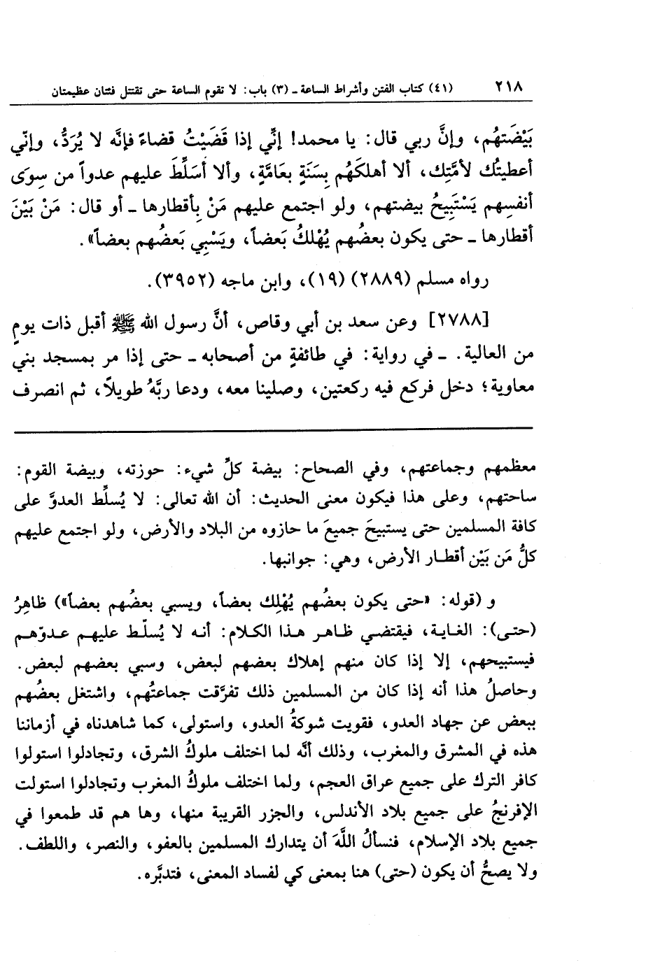 و(قوله: حتى يكون بعضهم يهلك بعضا، ويسبي بعضهم بعضا) ظاهر (حتى): الغاية، فيقتضي ظاهر هذا الكلام: أنه لا يسلط عليهم عدوهم فيستبيحهم، إلا إذا كان منهم إهلاك بعضهم لبعض، وسبي بعضهم لبعض. وحاصل هذا أنه إذا كان من المسلمين ذلك تفرقت جماعتهم، واشتغل بعضهم ببعض عن جهاد العدو، فقويت شوكة العدو واستولى، كما شاهدناه في أزماننا هذه في المشرق والمغرب، وذلك أنه لما اختلف ملوك الشرق، وتجادلوا استولوا كافر الترك على جميع عراق العجم، ولما اختلف ملوك المغرب وتجادلوا استولت الإفرنج على جميع بلاد الأندلس، والجزر القريبة منها، وها هم قد طمعوا في جميع بلاد الإسلام، فنسأل الله أن يتدارك المسلمين بالعفو والنصر واللطف. ولا يصح أن يكون (حتى) هنا بمعنى كي، لفساد المعنى، فتدبره.