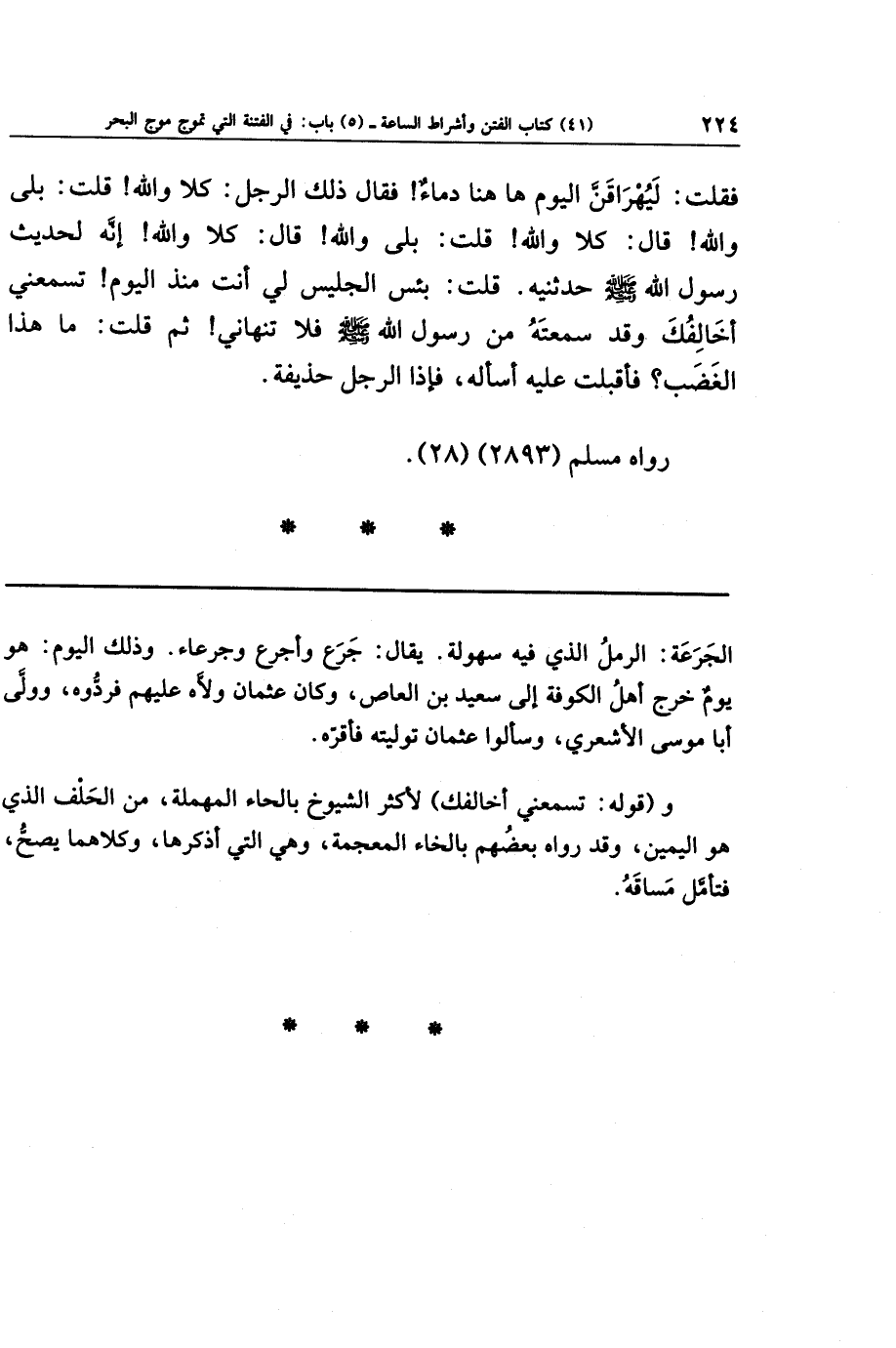 فَقُلتُ: لَيُهرَاقَنَّ اليَومَ هَاهُنَا دِمَاءٌ، فَقَالَ ذَاكَ الرَّجُلُ: كَلَّا وَاللَّهِ، قُلتُ: بَلَى وَاللَّهِ، قَالَ: كَلَّا وَاللَّهِ، قُلتُ: بَلَى وَاللَّهِ، قَالَ: كَلَّا وَاللَّهِ، إِنَّهُ لَحَدِيثُ رَسُولِ اللَّهِ صَلَّى اللَّهُ عَلَيهِ وَسَلَّمَ حَدَّثَنِيهِ، قُلتُ: بِئسَ الجَلِيسُ لِي أَنتَ مُنذُ اليَومِ، تَسمَعُنِي أُخَالِفُكَ وَقَد سَمِعتَهُ مِن رَسُولِ اللَّهِ صَلَّى اللَّهُ عَلَيهِ وَسَلَّمَ فَلَا تَنهَانِي؟ ثُمَّ قُلتُ: مَا هَذَا الغَضَبُ؟ فَأَقبَلتُ عَلَيهِ وَأَسأَلُهُ، فَإِذَا الرَّجُلُ حُذَيفَةُ.