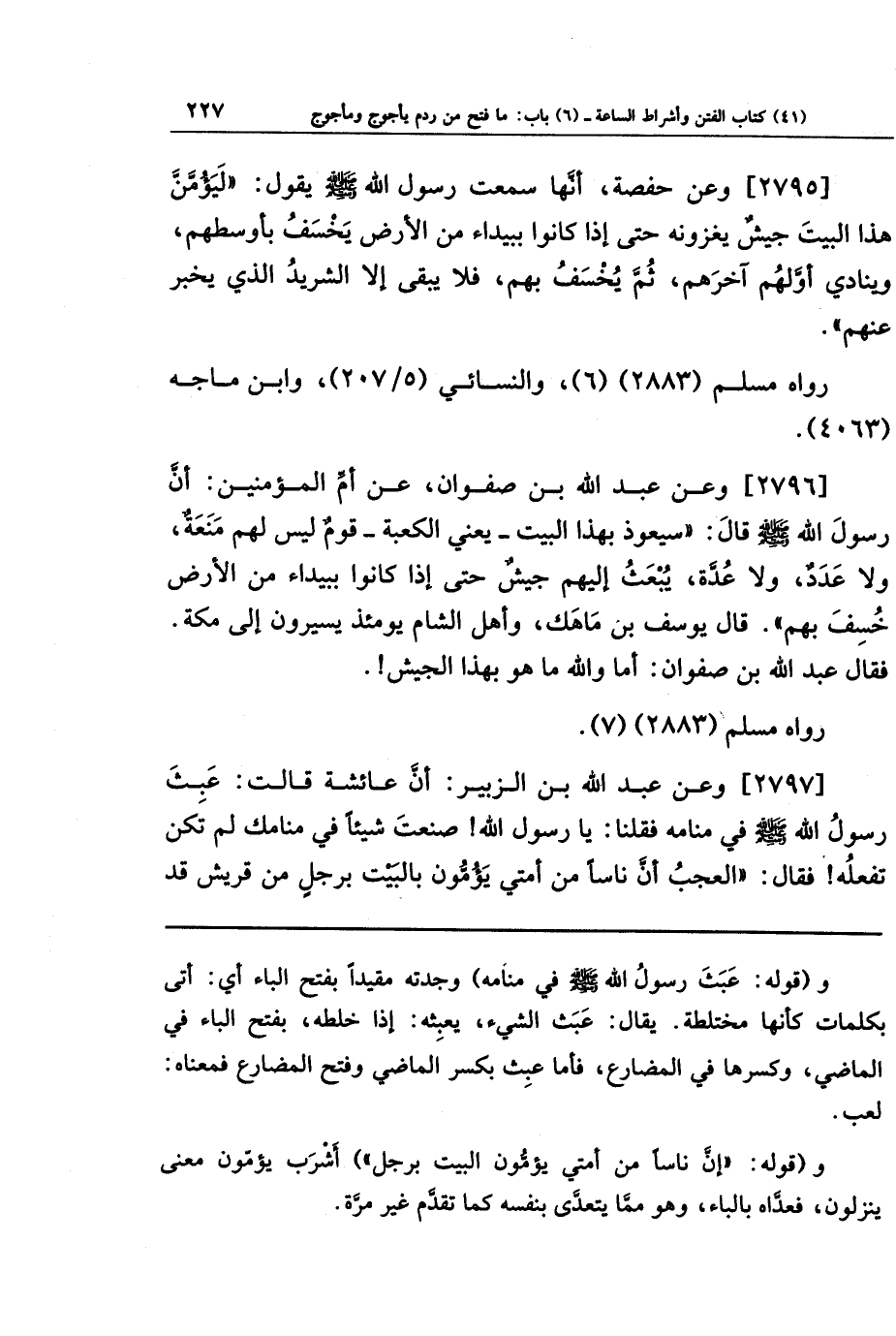 [2796] وعن عبد الله بن صفوان، عَن أُمِّ المُؤمِنِينَ، أَنَّ رَسُولَ اللَّهِ صَلَّى اللَّهُ عَلَيهِ وَسَلَّمَ قَالَ: سَيَعُوذُ بِهَذَا البَيتِ - يَعنِي الكَعبَةَ - قَومٌ لَيسَت لَهُم مَنَعَةٌ وَلَا عَدَدٌ وَلَا عُدَّةٌ، يُبعَثُ إِلَيهِم جَيشٌ حَتَّى إِذَا كَانُوا بِبَيدَاءَ مِن الأَرضِ خُسِفَ بِهِم، قَالَ يُوسُفُ بن ماهك: وَأَهلُ الشَّامِ يَومَئِذٍ يَسِيرُونَ إِلَى مَكَّةَ، فَقَالَ عَبدُ اللَّهِ بنُ صَفوَانَ: أَمَا وَاللَّهِ مَا هُوَ بِهَذَا الجَيشِ.