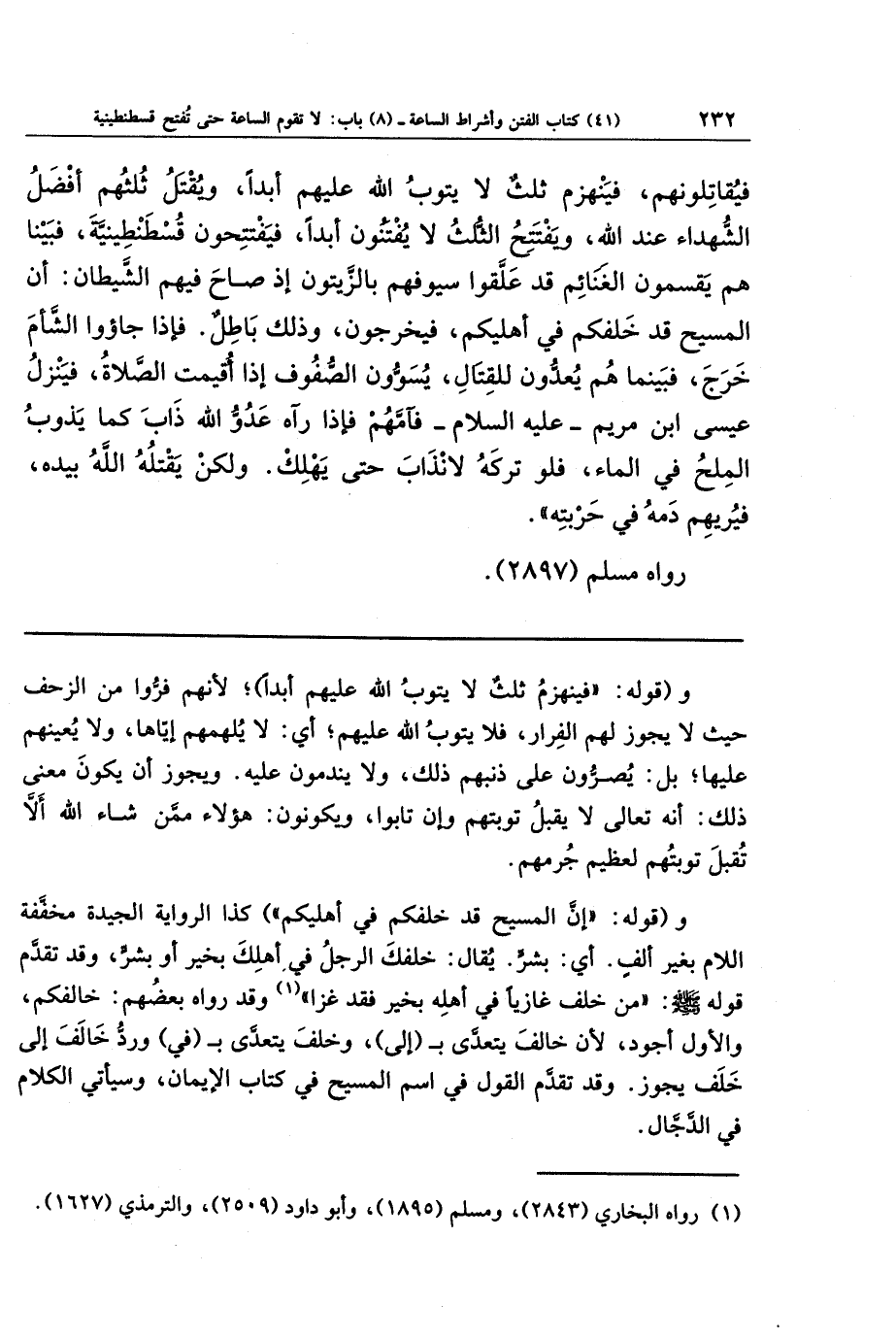 فَيُقَاتِلُونَهُم، فَيَنهَزِمُ ثُلُثٌ لَا يَتُوبُ اللَّهُ عَلَيهِم أَبَدًا، وَيُقتَلُ ثُلُثُهُم أَفضَلُ الشُّهَدَاءِ عِندَ اللَّهِ، وَيَفتَتِحُ الثُّلُثُ لَا يُفتَنُونَ أَبَدًا، فَيَفتَتِحُونَ قُسطَنطِينِيَّةَ، فَبَينَمَا هُم يَقتَسِمُونَ الغَنَائِمَ قَد عَلَّقُوا سُيُوفَهُم بِالزَّيتُونِ إِذ صَاحَ فِيهِم الشَّيطَانُ: أنَّ المَسِيحَ قَد خَلَفَكُم فِي أَهلِيكُم، فَيَخرُجُونَ، وَذَلِكَ بَاطِلٌ، فَإِذَا جَاؤوا الشَّأمَ خَرَجَ، فَبَينَمَا هُم يُعِدُّونَ لِلقِتَالِ يُسَوُّونَ الصُّفُوفَ إِذ أُقِيمَت الصَّلَاةُ، فَيَنزِلُ عِيسَى ابنُ مَريَمَ عليه السلام، فَآمَّهُم، فَإِذَا رَآهُ عَدُوُّ اللَّهِ ذَابَ كَمَا يَذُوبُ المِلحُ فِي المَاءِ، فَلَو تَرَكَهُ لَانذَابَ حَتَّى يَهلِكَ، وَلَكِن يَقتُلُهُ اللَّهُ بِيَدِهِ، فَيُرِيهِم دَمَهُ فِي حَربَتِهِ.
