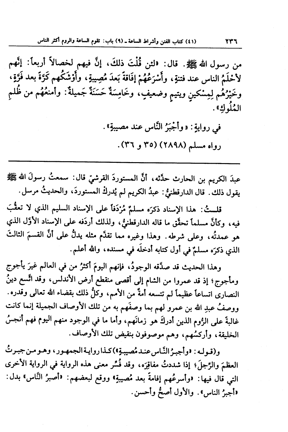 وهذا الحديث قد صدقه الوجود، فإنَّهم اليوم أكثر من في العالم غير يأجوج ومأجوج؛ إذ قد عمروا من الشام إلى أقصى منقطع أرض الأندلس، وقد اتسع دين النصارى اتساعا عظيما لم تتسعه أمة من الأمم، وكل ذلك بقضاء الله تعالى وقدره. ووصف عبد الله بن عمرو لهم بما وصفهم به من تلك الأوصاف الجميلة، إنما كانت غالبة على الروم الذين أدرك هو زمانهم، وأما ما في الوجود منهم اليوم فهم أنجس الخليقة وأركسهم، وهم موصوفون بنقيض تلك الأوصاف.