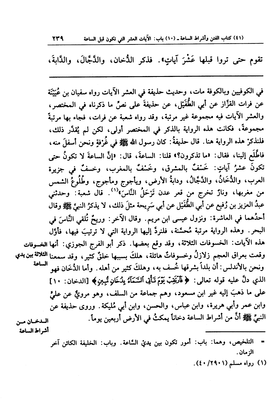 في الكوفيين وبالكوفة مات، وحديث حذيفة في العشر الآيات رواه سفيان بن عيينة عن فرات القزاز عن أبي الطفيل، عن حذيفة على نص ما ذكرناه في المختصر، والعشر الآيات فيه مجموعة غير مرتبة، وقد رواه شعبة عن فرات، فجاء بها مرتبة مجموعة، فكانت هذه الرواية بالذكر في المختصر أولى، لكن لم يقدر ذلك، فلنذكر هذه الرواية هنا. قال حذيفة: كان رسول الله صلى الله عليه وسلم في غرفة ونحن أسفل منه، فاطلع إلينا، فقال: ما تذكرون؟ قلنا: الساعة، قال: إن الساعة لا تكون حتى تكون عشر آيات: خسف بالمشرق، وخسف بالمغرب، وخسف في جزيرة العرب، والدخان، والدجال، ودابة الأرض، ويأجوج ومأجوج، وطلوع الشمس من مغربها، ونار تخرج من قعر عدن ترحل الناس (¬1). قال شعبة: وحدثني عبد العزيز بن رفيع عن أبي الطفيل عن أبي سريحة مثل ذلك، لا يذكر النبي صلى الله عليه وسلم، وقال أحدهما في العاشرة: ونزول عيسى ابن مريم. وقال الآخر: وريح تلقي الناس في البحر. وهذه الرواية مرتبة محسنة، فلنرد إليها الرواية التي لا ترتيب فيها، فأول هذه الآيات: الخسوفات الثلاثة، وقد وقع بعضها. ذكر أبو الفرج الجوزي: أنها وقعت بعراق العجم زلازل وخسوفات هائلة، هلك بسببها خلق كثير، وقد سمعنا ونحن بالأندلس أن بلدا بشرقها خسف به، وهلك كثير من أهله. وأما الدخان فهو الذي دل عليه قوله تعالى: {فَارتَقِب يَومَ تَأتِي السَّمَاءُ بِدُخَانٍ مُبِينٍ} على ما ذهب إليه غير ابن مسعود، وهم جماعة من السلف، وهو مروي عن علي وابن عمر وأبي هريرة، وابن عباس، والحسن، وابن أبي مليكة. وروى حذيفة عن النبي صلى الله عليه وسلم أن من أشراط الساعة دخانا يمكث في الأرض أربعين يوما.