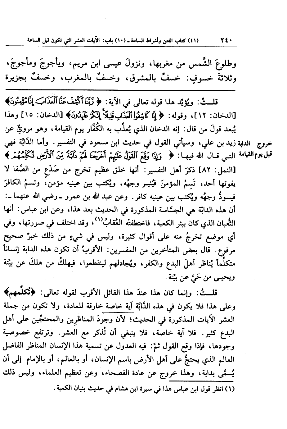 قلت: ويؤيد هذا قوله تعالى في الآية: {رَبَّنَا اكشِف عَنَّا العَذَابَ إِنَّا مُؤمِنُونَ} وقوله: {إِنَّا كَاشِفُو العَذَابِ قَلِيلا إِنَّكُم عَائِدُونَ} وهذا يبعد قول من قال: إنه الدخان الذي يعذب به الكفار يوم القيامة، وهو مروي عن زيد بن علي، وسيأتي القول في حديث ابن مسعود في التفسير. وأما الدابة فهي التي قال الله فيها: {وَإِذَا وَقَعَ القَولُ عَلَيهِم أَخرَجنَا لَهُم دَابَّةً مِنَ الأَرضِ تُكَلِّمُهُم} ذكر أهل التفسير أنها خلق عظيم تخرج من صدع من الصفا لا يفوتها أحد، تسم المؤمن فينير وجهه، ويُكتب بين عينيه مؤمن، وتسم الكافر فيسود وجهه ويكتب بين عينيه كافر. وعن عبد الله بن عمرو - رضي الله عنهما - أن هذه الدابة هي الجساسة المذكورة في الحديث بعد هذا، وعن ابن عباس: أنها الثعبان الذي كان ببئر الكعبة، فاختطفته العقاب (¬1)، وقد اختلف في صورتها، وفي أي موضع تخرج منه على أقوال كثيرة، وليس في شيء من ذلك خبر صحيح مرفوع. قال بعض المتأخرين من المفسرين: الأقرب أن تكون هذه الدابة إنسانا متكلما يناظر أهل البدع والكفر، ويجادلهم لينقطعوا، فيهلك من هلك عن بينة ويحيى من حي عن بينة.