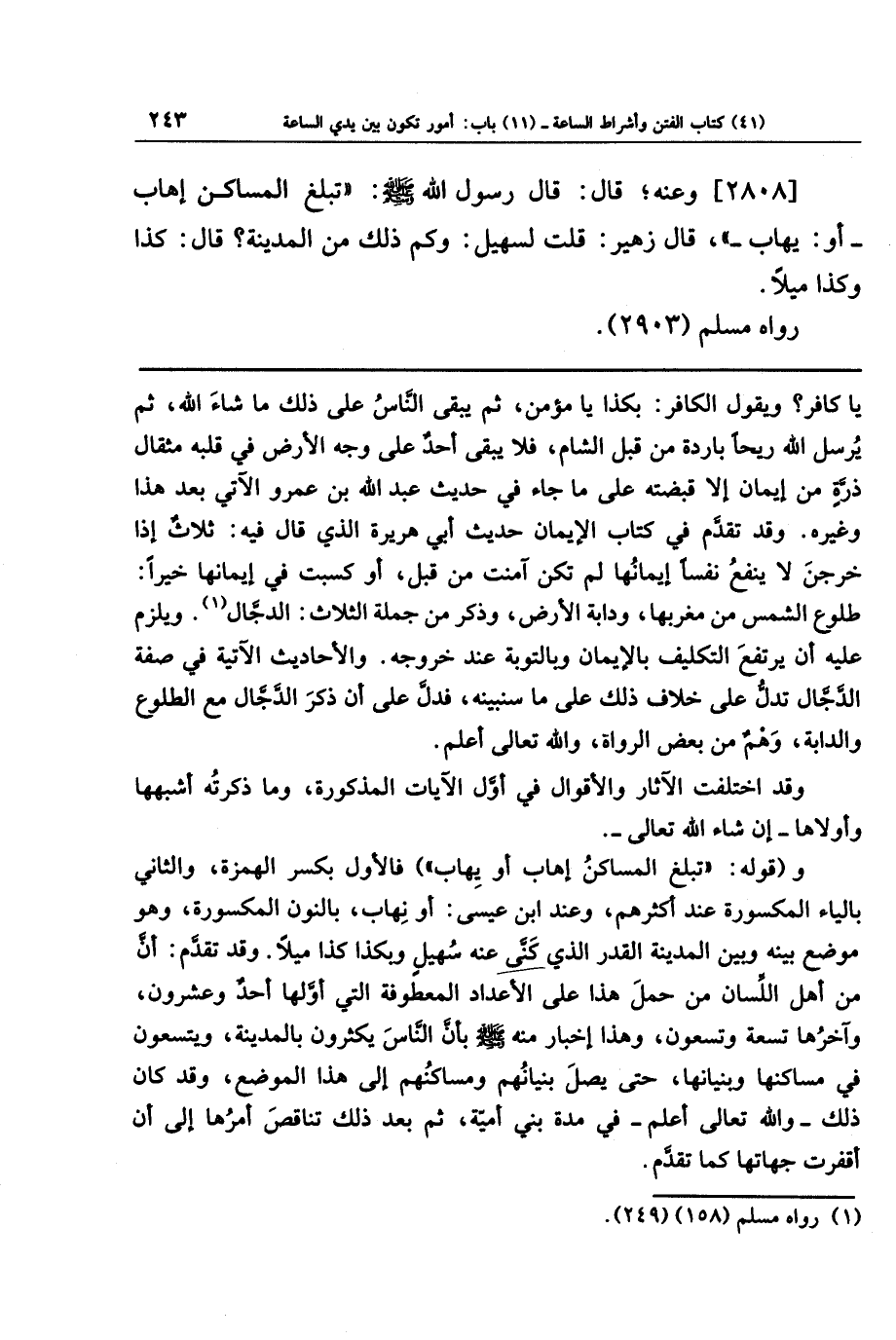 و(قوله: تبلغ المساكن إهاب أو يهاب) فالأول بكسر الهمزة، والثاني بالياء المكسورة عند أكثرهم، وعند ابن عيسى: أو نهاب، بالنون المكسورة، وهو موضع بينه وبين المدينة القدر الذي كنى عنه سهيل بكذا كذا ميلا. وقد تقدَّم أن من أهل اللسان من حمل هذا على الأعداد المعطوفة التي أولها أحد وعشرون، وآخرها تسعة وتسعون، وهذا إخبار منه صلى الله عليه وسلم بأن الناس يكثرون بالمدينة، ويتسعون في مساكنها وبنيانها، حتى يصل بنيانهم ومساكنهم إلى هذا الموضع، وقد كان ذلك - والله تعالى أعلم - في مدة بني أمية، ثم بعد ذلك تناقص أمرها إلى أن أقفرت جهاتها كما تقدَّم.