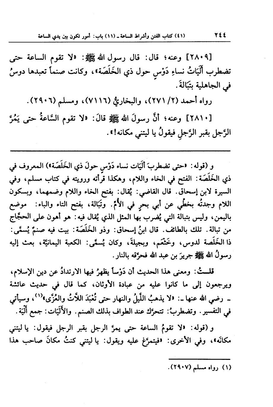 [2809] وعنه قال: قال رسول الله صلى الله عليه وسلم: لا تقوم الساعة حتى تضطرب أليات نساء دوس حول ذي الخلصة. وكانت صنما تعبدها دوس في الجاهلية بتبالة.