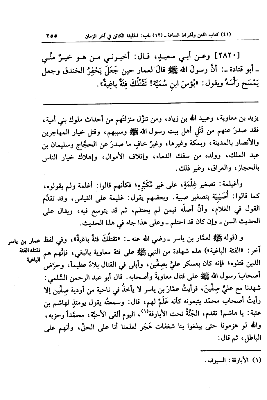 و(قوله صلى الله عليه وسلم لعمار بن ياسر -رضي الله عنه -: تقتلك فئة باغية، وفي لفظ آخر: الفئة الباغية) هذه شهادة من النبي صلى الله عليه وسلم على فئة معاوية بالبغي، فإنهم هم الذين قتلوه؛ فإنَّه كان بعسكر علي بصفين، وأبلى في القتال بلاء عظيما، وحرض أصحاب رسول الله صلى الله عليه وسلم على قتال معاوية وأصحابه. قال أبو عبد الرحمن السلمي: شهدنا مع علي صفين، فرأيت عمار بن ياسر لا يأخذ في ناحية من أودية صفين إلا رأيت أصحاب محمد يتبعونه كأنه علم لهم، قال: وسمعته يقول يومئذ لهاشم بن عتبة: يا هاشم تقدم، الجنة تحت الأبارقة (¬1)، اليوم ألقى الأحبة، محمدا وحزبه، والله لو هزمونا حتى يبلغوا بنا شغفات هجر لعلمنا أنا على الحق وأنهم على الباطل، ثم قال: