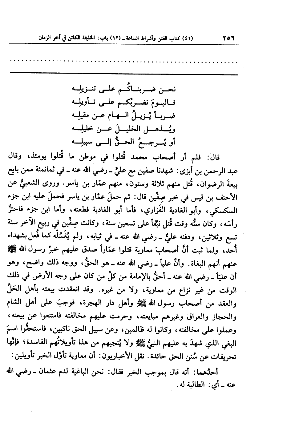 قال: فلم أر أصحاب محمد قُتلوا في موطن ما قتلوا يومئذ، وقال عبد الرحمن بن أبزى: شهدنا صفين مع علي - رضي الله عنه - في ثمانمائة ممن بايع بيعة الرضوان، قتل منهم ثلاثة وستون، منهم عمار بن ياسر. وروى الشعبي عن الأحنف بن قيس في خبر صفين قال: ثم حمل عمار بن ياسر فحمل عليه ابن جزء السكسكي، وأبو الغادية الفزاري، فأمَّا أبو الغادية فطعنه، وأما ابن جزء فاحتز رأسه، وكان سنه وقت قتل نيفا على تسعين سنة، وكانت صفين في ربيع الآخر سنة تسع وثلاثين، ودفنه علي - رضي الله عنه - في ثيابه، ولم يغسله كما فعل بشهداء أحد، ولما ثبت أن أصحاب معاوية قتلوا عمارا صدق عليهم خبر رسول الله - صلى الله عليه وسلم - عنهم أنهم البغاة، وأن عليا - رضي الله عنه - هو الحق، ووجه ذلك واضح، وهو أن عليا - رضي الله عنه - أحق بالإمامة من كل من كان على وجه الأرض في ذلك الوقت من غير نزاع من معاوية ولا من غيره. وقد انعقدت بيعته بأهل الحل والعقد من أصحاب رسول الله صلى الله عليه وسلم، وأهل دار الهجرة، فوجب على أهل الشام والحجاز والعراق وغيرهم مبايعته، وحرمت عليهم مخالفته، فامتنعوا عن بيعته وعملوا على مخالفته، وكانوا له ظالمين، وعن سبيل الحق ناكبين، فاستحقوا اسم البغي الذي شهد به عليهم النبي صلى الله عليه وسلم، ولا ينجيهم من هذا تأويلاتهم الفاسدة، فإنها تحريفات عن سنن الحق حائدة. نقل الأخباريون: أن معاوية تأول الخبر تأويلين: