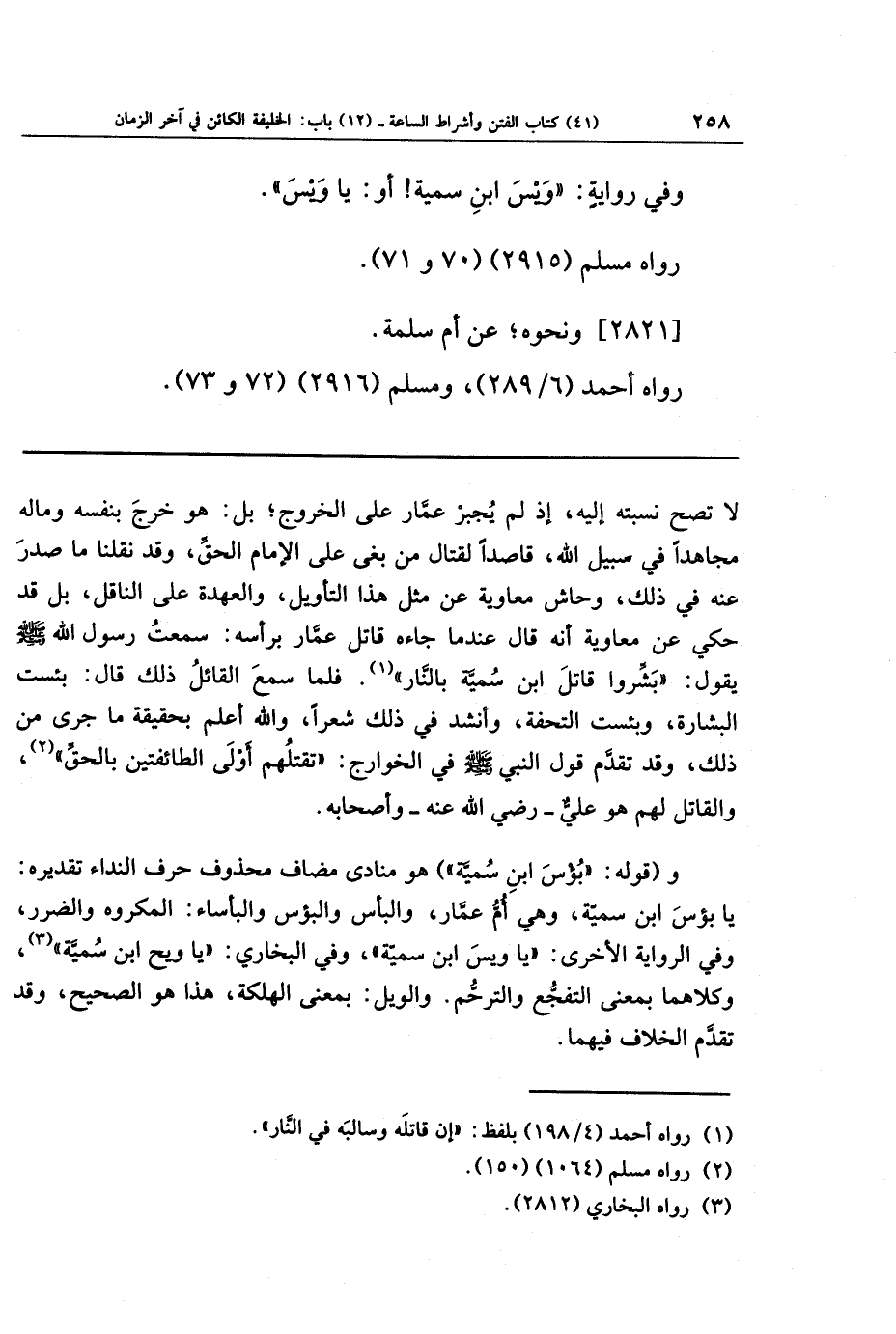 و(قوله: بؤس ابن سمية) هو منادى مضاف محذوف حرف النداء، تقديره: يا بؤس ابن سمية، وهي أم عمار، والبأس والبؤس والبأساء: المكروه والضرر، وفي الرواية الأخرى: يا ويسَ ابن سمية، وفي البخاري: يا ويح ابن سمية (¬3)، وكلاهما بمعنى التفجع والترحم. والويل: بمعنى الهلكة، هذا هو الصحيح، وقد تقدَّم الخلاف فيهما.