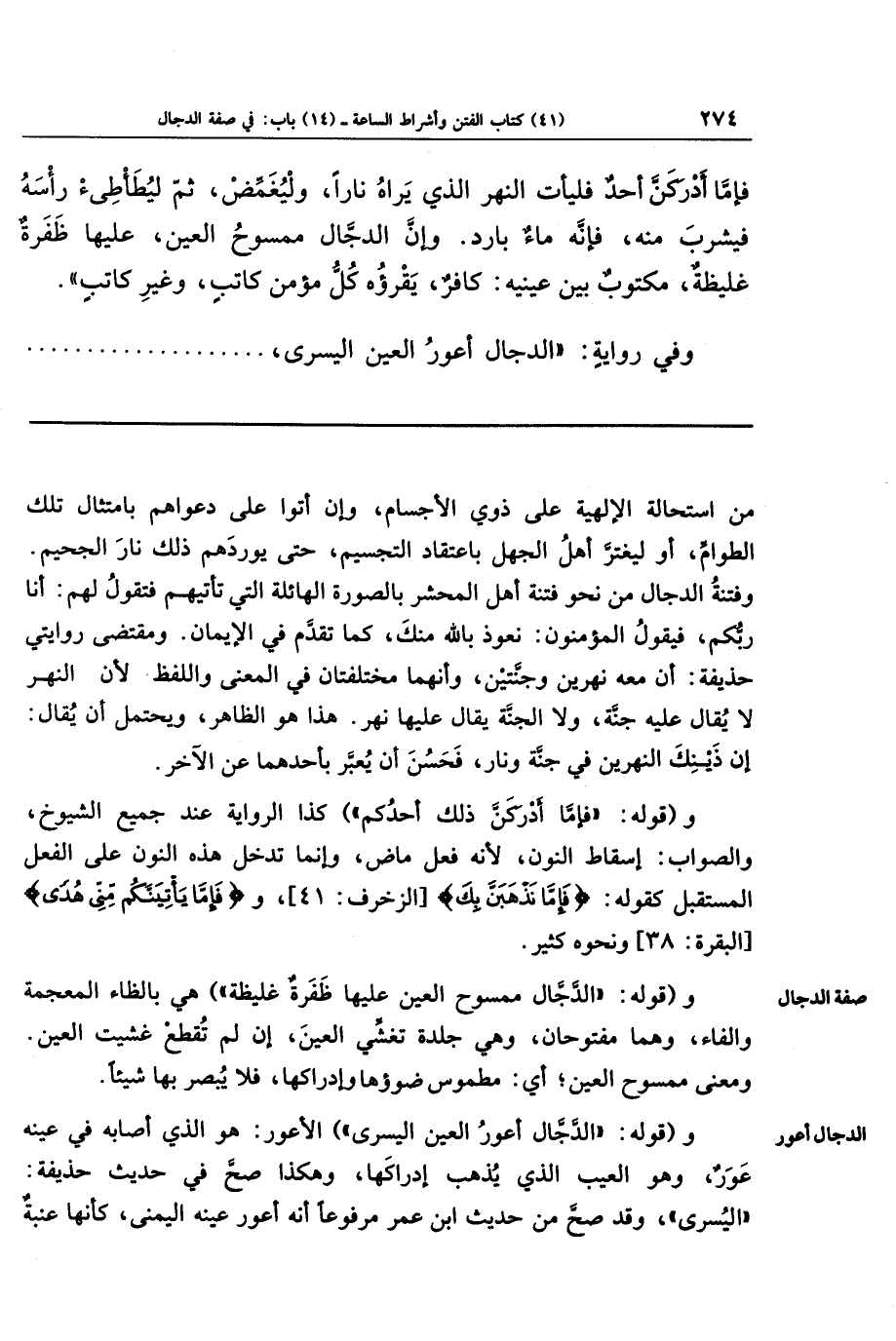 فَإِمَّا أَدرَكَنَّ أَحَدٌ فَليَأتِ النَّهرَ الَّذِي يَرَاهُ نَارًا، وَليُغَمِّض ثُمَّ ليُطَأطِئ رَأسَهُ فَيَشرَبَ مِنهُ، فَإِنَّهُ مَاءٌ بَارِدٌ، وَإِنَّ الدَّجَّالَ مَمسُوحُ العَينِ، عَلَيهَا ظَفَرَةٌ غَلِيظَةٌ، مَكتُوبٌ بَينَ عَينَيهِ كَافِرٌ، يَقرَؤُهُ كُلُّ مُؤمِنٍ، كَاتِبٍ وَغَيرِ كَاتِبٍ.
