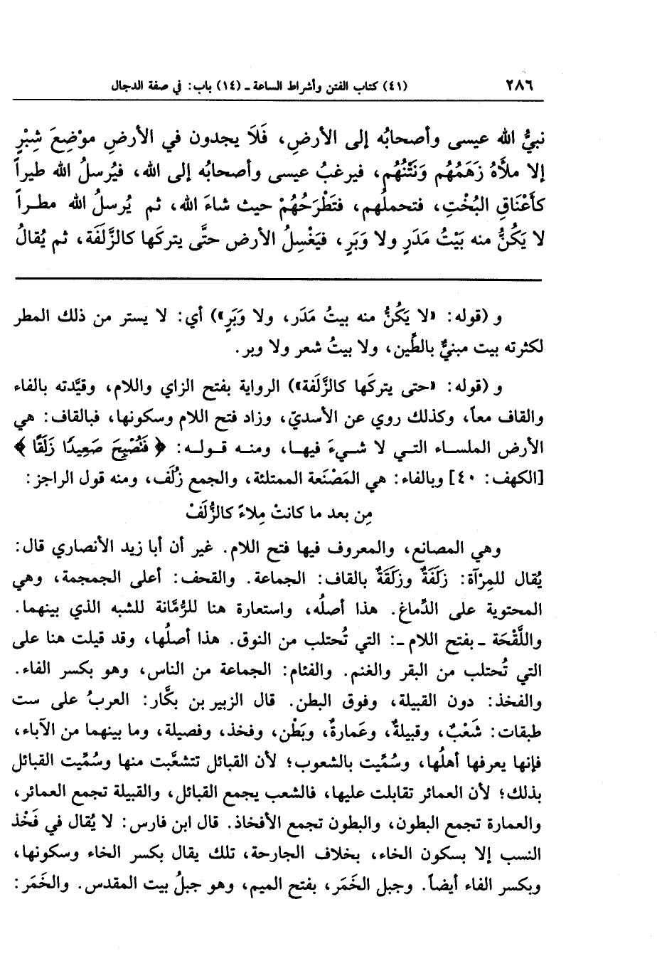 وهي المصانع، والمعروف فيها فتح اللام. غير أن أبا زيد الأنصاري قال: يقال للمرآة: زلفة وزلقة بالقاف: الجماعة. والقحف: أعلى الجمجمة، وهي المحتوية على الدماغ. هذا أصله، واستعارة هنا للرمانة للشبه الذي بينهما. واللقحة - بفتح اللام - التي تحتلب من النوق. هذا أصلها، وقد قيلت هنا على التي تحتلب من البقر والغنم. والفئام: الجماعة من الناس، وهو بكسر الفاء. والفخذ دون القبيلة وفوق البطن. قال الزبير بن بكار: العرب على ست طبقات: شعب، وقبيلة، وعمارة، وبطن، وفخذ، وفصيلة، وما بينهما من الآباء، فإنَّها يعرفها أهلها، وسميت بالشعوب؛ لأنَّ القبائل تتشعب منها وسميت القبائل بذلك؛ لأنَّ العمائر تقابلت عليها، فالشعب يجمع القبائل، والقبيلة تجمع العمائر، والعمارة تجمع البطون، والبطون تجمع الأفخاذ. قال ابن فارس: لا يقال في فخذ النسب إلا بسكون الخاء، بخلاف الجارحة، تلك يقال بكسر الخاء وسكونها، وبكسر الفاء أيضًا. وجبل الخمَر، بفتح الميم، وهو جبل بيت المقدس. والخمر: