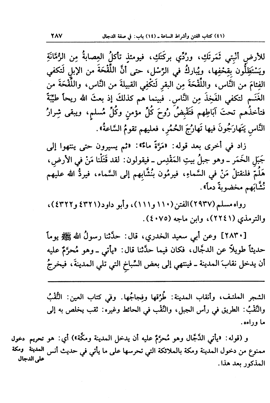 [2830] وعن أبي سَعِيدٍ الخُدرِيَّ قَالَ: حَدَّثَنَا رَسُولُ اللَّهِ صَلَّى اللَّهُ عَلَيهِ وَسَلَّمَ يَومًا حَدِيثًا طَوِيلًا عَن الدَّجَّالِ، فَكَانَ فِيمَا حَدَّثَنَا قَالَ: يَأتِي وَهُوَ مُحَرَّمٌ عَلَيهِ أَن يَدخُلَ نِقَابَ المَدِينَةِ، فَيَنتَهِي إِلَى بَعضِ السِّبَاخِ الَّتِي تَلِي المَدِينَةَ، فَيَخرُجُ
