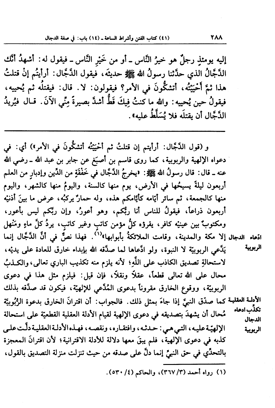 إِلَيهِ يَومَئِذٍ رَجُلٌ هُوَ خَيرُ النَّاسِ - أَو: مِن خَيرِ النَّاسِ - فَيَقُولُ لَهُ: أَشهَدُ أَنَّكَ الدَّجَّالُ الَّذِي حَدَّثَنَا رَسُولُ اللَّهِ صَلَّى اللَّهُ عَلَيهِ وَسَلَّمَ حَدِيثَهُ، فَيَقُولُ الدَّجَّالُ: أَرَأَيتُم إِن قَتَلتُ هَذَا ثُمَّ أَحيَيتُهُ أَتَشُكُّونَ فِي الأَمرِ؟ فَيَقُولُونَ: لَا، قَالَ: فَيَقتُلُهُ ثُمَّ يُحيِيهِ فَيَقُولُ حِينَ يُحيِيهِ: وَاللَّهِ مَا كُنتُ فِيكَ قَطُّ أَشَدَّ بَصِيرَةً مِنِّي الآنَ، قَالَ: فَيُرِيدُ الدَّجَّالُ أَن يَقتُلَهُ فَلَا يُسَلَّطُ عَلَيهِ.