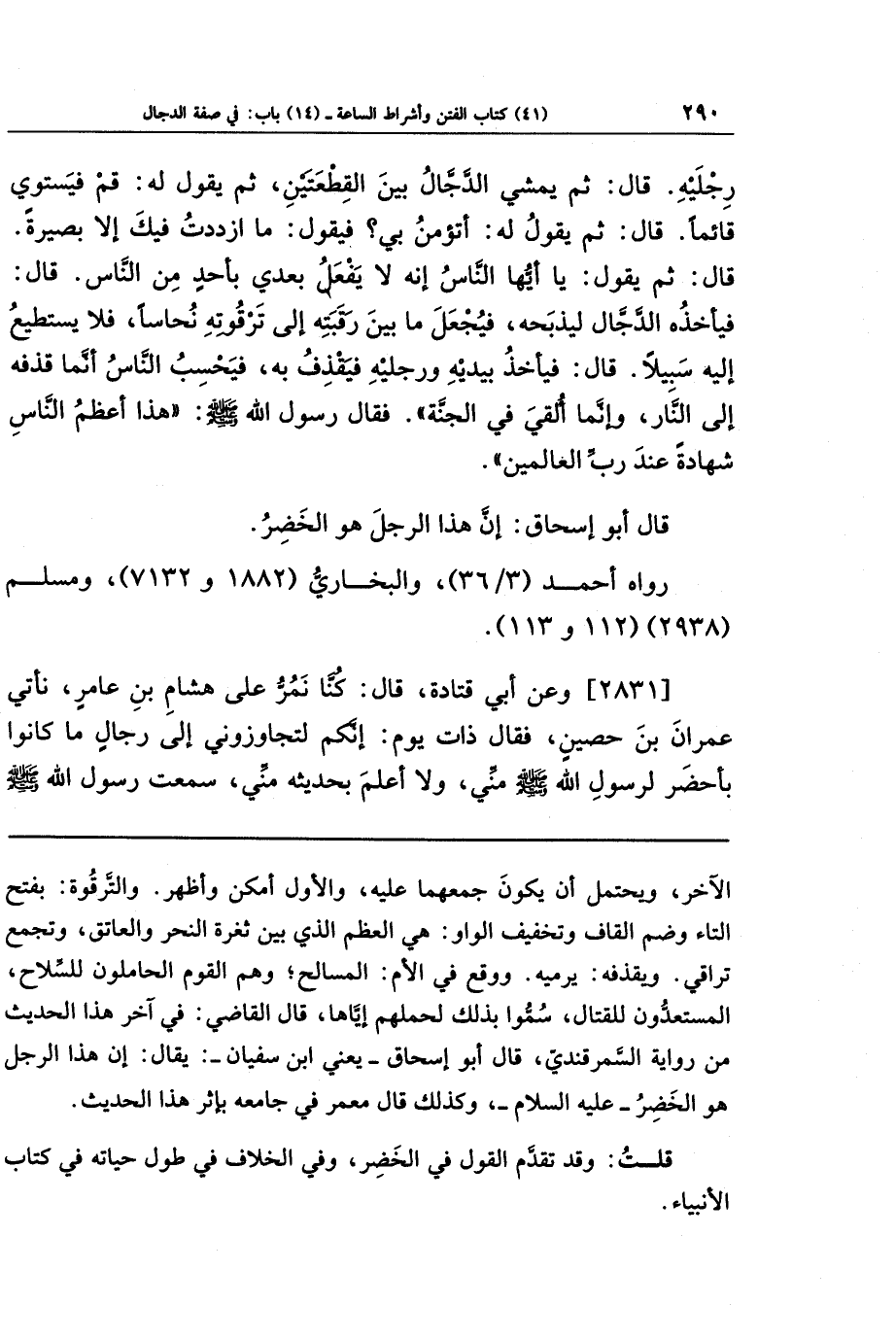 رِجلَيهِ، قَالَ: ثُمَّ يَمشِي الدَّجَّالُ بَينَ القِطعَتَينِ ثُمَّ يَقُولُ لَهُ: قُم، فَيَستَوِي قَائِمًا، قَالَ: ثُمَّ يَقُولُ لَهُ: أَتُؤمِنُ بِي؟ فَيَقُولُ: مَا ازدَدتُ فِيكَ إِلَّا بَصِيرَةً، قَالَ: ثُمَّ يَقُولُ: يَا أَيُّهَا النَّاسُ إِنَّهُ لَا يَفعَلُ بَعدِي بِأَحَدٍ مِن النَّاسِ، قَالَ: فَيَأخُذُهُ الدَّجَّالُ لِيَذبَحَهُ فَيُجعَلَ مَا بَينَ رَقَبَتِهِ إِلَى تَرقُوَتِهِ نُحَاسًا، فَلَا يَستَطِيعُ إِلَيهِ سَبِيلًا، قَالَ: فَيَأخُذُ بِيَدَيهِ وَرِجلَيهِ فَيَقذِفُ بِهِ، فَيَحسِبُ النَّاسُ أَنَّمَا قَذَفَهُ إِلَى النَّارِ، وَإِنَّمَا أُلقِيَ فِي الجَنَّةِ، فَقَالَ رَسُولُ اللَّهِ صَلَّى اللَّهُ عَلَيهِ وَسَلَّمَ: هَذَا أَعظَمُ النَّاسِ شَهَادَةً عِندَ رَبِّ العَالَمِينَ.
