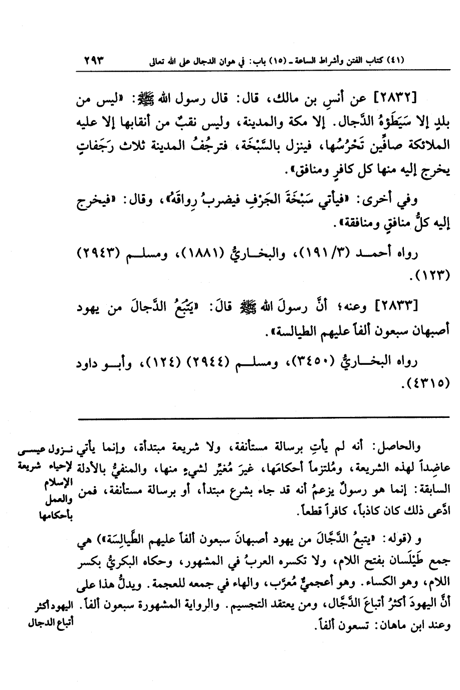 [2833] وعنه، أن رسول الله صلى الله عليه وسلم قال: يتبع الدجال من يهود أصبهان سبعون ألفا عليهم الطيالسة.