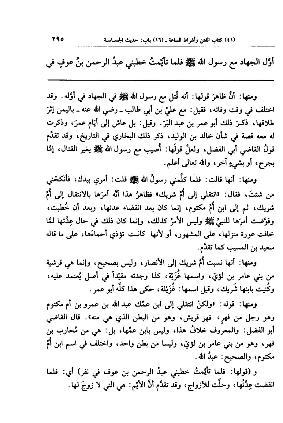 أَوَّلِ الجِهَادِ مَعَ رَسُولِ اللَّهِ صَلَّى اللَّهُ عَلَيهِ وَسَلَّمَ، فَلَمَّا تَأَيَّمتُ خَطَبَنِي عَبدُ الرَّحمَنِ بنُ عَوفٍ فِي