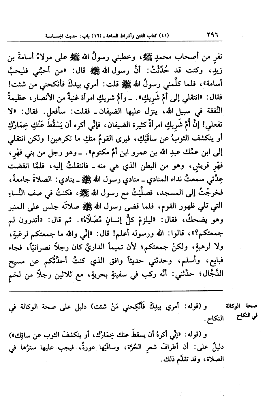 نَفَرٍ مِن أَصحَابِ محمد صَلَّى اللَّهُ عَلَيهِ وَسَلَّمَ، وَخَطَبَنِي رَسُولُ اللَّهِ صَلَّى اللَّهُ عَلَيهِ وَسَلَّمَ عَلَى مَولَاهُ أُسَامَةَ بنِ زَيدٍ، وَكُنتُ قَد حُدِّثتُ أَنَّ رَسُولَ اللَّهِ صَلَّى اللَّهُ عَلَيهِ وَسَلَّمَ قَالَ: مَن أَحَبَّنِي فَليُحِبَّ أُسَامَةَ، فَلَمَّا كَلَّمَنِي رَسُولُ اللَّهِ صَلَّى اللَّهُ عَلَيهِ وَسَلَّمَ قُلتُ: أَمرِي بِيَدِكَ، فَأَنكِحنِي مَن شِئتَ، فَقَالَ: انتَقِلِي إِلَى أُمِّ شَرِيكٍ، وَأُمُّ شَرِيكٍ امرَأَةٌ غَنِيَّةٌ مِن الأَنصَارِ عَظِيمَةُ النَّفَقَةِ فِي سَبِيلِ اللَّهِ، يَنزِلُ عَلَيهَا الضِّيفَانُ، فَقُلتُ: سَأَفعَلُ، فَقَالَ: لَا تَفعَلِي؛ إِنَّ أُمَّ شَرِيكٍ امرَأَةٌ كَثِيرَةُ الضِّيفَانِ، فَإِنِّي أَكرَهُ أَن يَسقُطَ عَنكِ خِمَارُكِ أَو يَنكَشِفَ الثَّوبُ عَن سَاقَيكِ، فَيَرَى القَومُ مِنكِ مَا تَكرَهِينَ، وَلَكِن انتَقِلِي إِلَى ابنِ عَمِّكِ عَبدِ اللَّهِ بنِ عَمرِو ابنِ أُمِّ مَكتُومٍ، وَهُوَ رَجُلٌ مِن بَنِي فِهرٍ، فِهرِ قُرَيشٍ، وَهُوَ مِن البَطنِ الَّذِي هِيَ مِنهُ، فَانتَقَلتُ إِلَيهِ، فَلَمَّا انقَضَت عِدَّتِي سَمِعتُ نِدَاءَ المُنَادِي - مُنَادِي رَسُولِ اللَّهِ صَلَّى اللَّهُ عَلَيهِ وَسَلَّمَ - يُنَادِي: الصَّلَاةَ جَامِعَةً، فَخَرَجتُ إِلَى المَسجِدِ فَصَلَّيتُ مَعَ رَسُولِ اللَّهِ صَلَّى اللَّهُ عَلَيهِ وَسَلَّمَ، فَكُنتُ فِي صَفِّ النِّسَاءِ الَّتِي تَلِي ظُهُورَ القَومِ، فَلَمَّا قَضَى رَسُولُ اللَّهِ صَلَّى اللَّهُ عَلَيهِ وَسَلَّمَ صَلَاتَهُ، جَلَسَ عَلَى المِنبَرِ وَهُوَ يَضحَكُ، فَقَالَ: لِيَلزَم كُلُّ إِنسَانٍ مُصَلَّاهُ، ثُمَّ قَالَ: أَتَدرُونَ لِمَ جَمَعتُكُم؟ قَالُوا: اللَّهُ وَرَسُولُهُ أَعلَمُ، قَالَ: إِنِّي وَاللَّهِ مَا جَمَعتُكُم لِرَغبَةٍ وَلَا لِرَهبَةٍ، وَلَكِن جَمَعتُكُم لِأَنَّ تَمِيمًا الدَّارِيَّ كَانَ رَجُلًا نَصرَانِيًّا فَجَاءَ فَبَايَعَ وَأَسلَمَ، وَحَدَّثَنِي حَدِيثًا وَافَقَ الَّذِي كُنتُ أُحَدِّثُكُم عَن مَسِيحِ الدَّجَّالِ، حَدَّثَنِي أَنَّهُ رَكِبَ فِي سَفِينَةٍ بَحرِيَّةٍ مَعَ ثَلَاثِينَ رَجُلًا مِن لَخمٍ