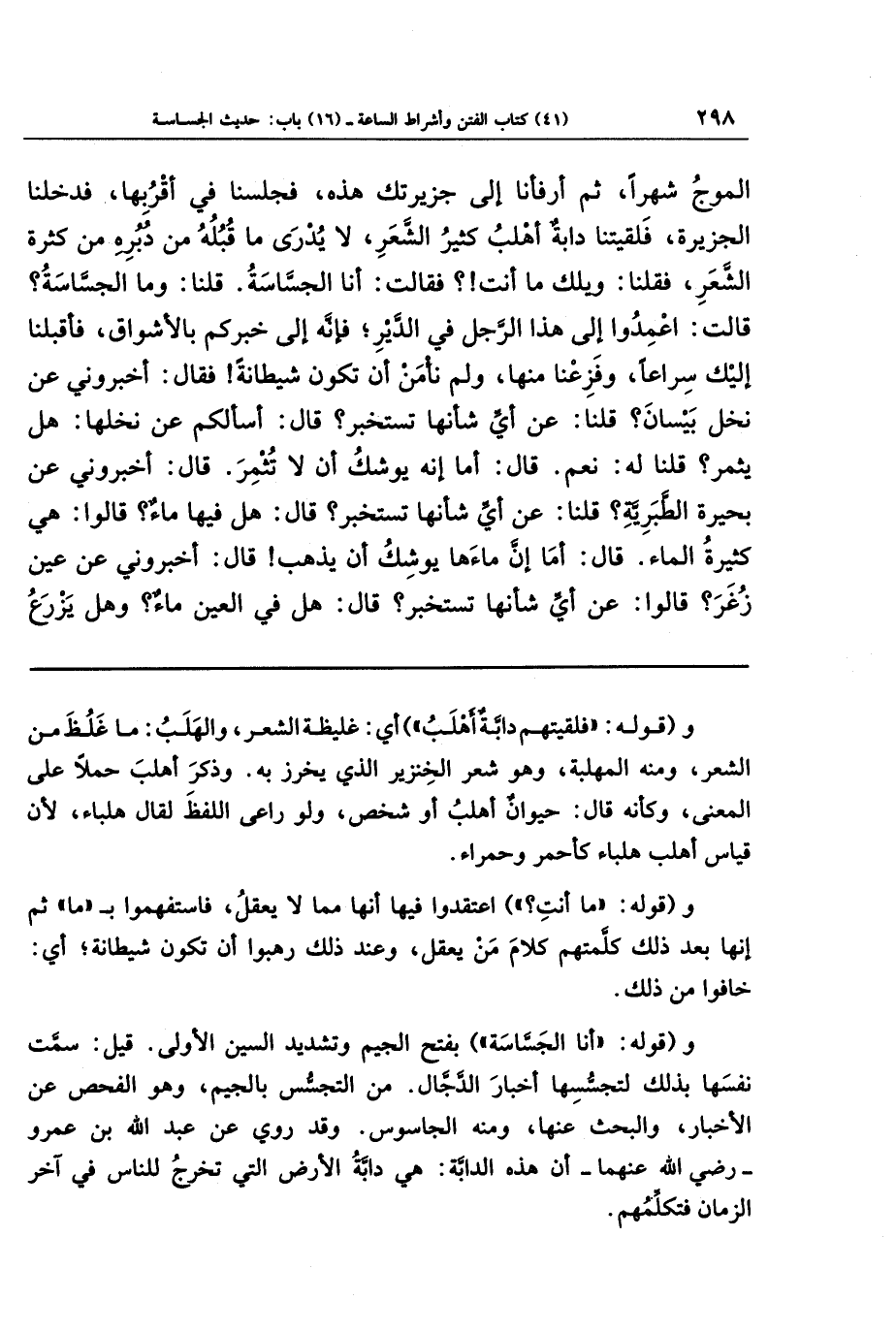 المَوجُ شَهرًا ثُمَّ أَرفَأنَا إِلَى جَزِيرَتِكَ هَذِهِ فَجَلَسنَا فِي أَقرُبِهَا فَدَخَلنَا الجَزِيرَةَ، فَلَقِيَتنَا دَابَّةٌ أَهلَبُ كَثِيرُ الشَّعَرِ لَا يُدرَى مَا قُبُلُهُ مِن دُبُرِهِ مِن كَثرَةِ الشَّعَرِ، فَقُلنَا: وَيلَكِ مَا أَنتِ؟ فَقَالَت: أَنَا الجَسَّاسَةُ، قُلنَا: وَمَا الجَسَّاسَةُ؟ قَالَت: اعمِدُوا إِلَى هَذَا الرَّجُلِ فِي الدَّيرِ؛ فَإِنَّهُ إِلَى خَبَرِكُم بِالأَشوَاقِ، فَأَقبَلنَا إِلَيكَ سِرَاعًا وَفَزِعنَا مِنهَا وَلَم نَأمَن أَن تَكُونَ شَيطَانَةً، فَقَالَ: أَخبِرُونِي عَن نَخلِ بَيسَانَ، قُلنَا: عَن أَيِّ شَأنِهَا تَستَخبِرُ؟ قَالَ: أَسأَلُكُم عَن نَخلِهَا هَل يُثمِرُ؟ قُلنَا لَهُ: نَعَم، قَالَ: أَمَا إِنَّهُ يُوشِكُ أَن لَا تُثمِرَ، قَالَ: أَخبِرُونِي عَن بُحَيرَةِ الطَّبَرِيَّةِ، قُلنَا: عَن أَيِّ شَأنِهَا تَستَخبِرُ؟ قَالَ: هَل فِيهَا مَاءٌ؟ قَالُوا: هِيَ كَثِيرَةُ المَاءِ، قَالَ: أَمَا إِنَّ مَاءَهَا يُوشِكُ أَن يَذهَبَ، قَالَ: أَخبِرُونِي عَن عَينِ زُغَرَ، قَالُوا: عَن أَيِّ شَأنِهَا تَستَخبِرُ؟ قَالَ: هَل فِي العَينِ مَاءٌ؟ وَهَل يَزرَعُ