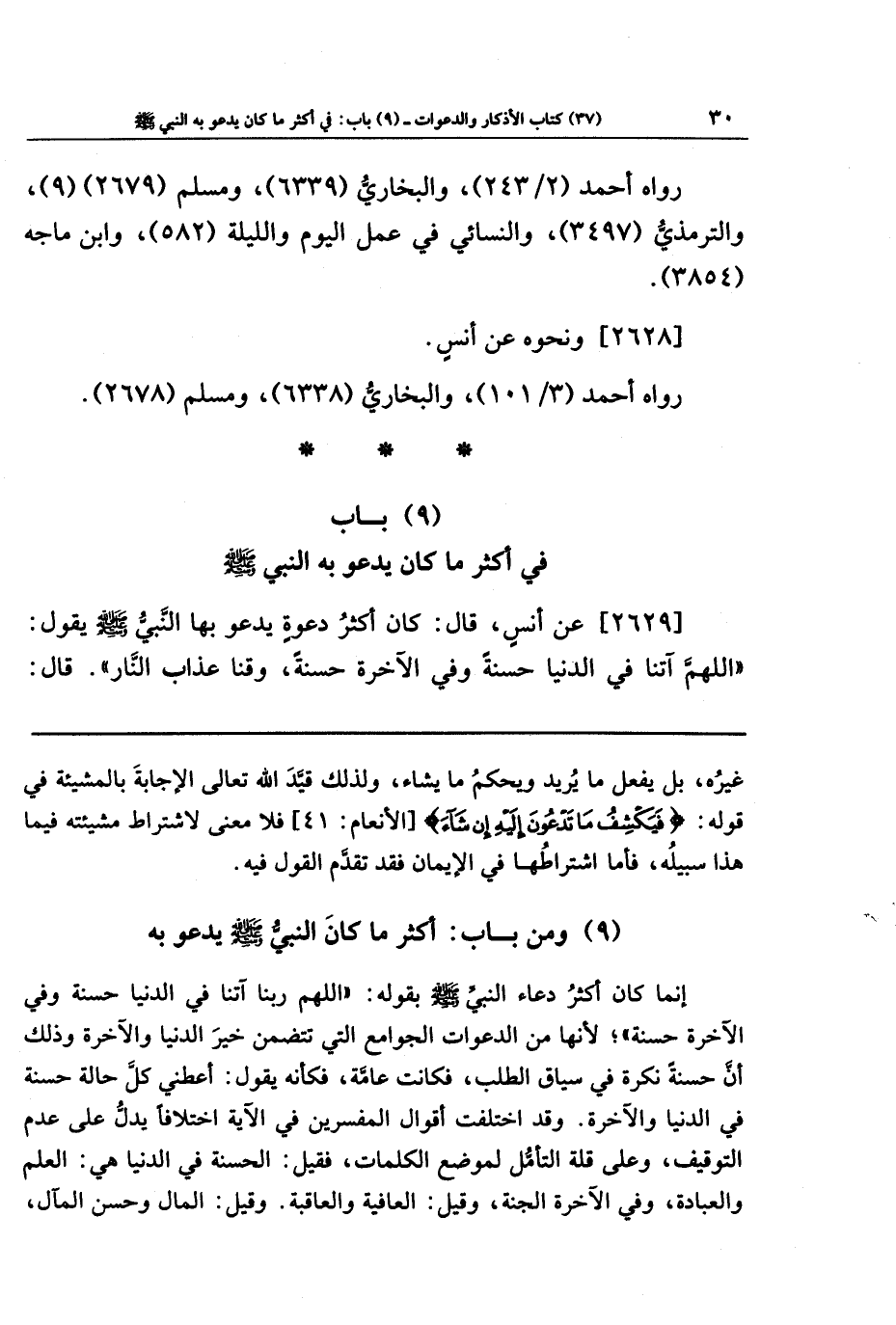 [2629] عن أنس قال: كان أكثر دعوة يدعو بها النبي صلى الله عليه وسلم يقول: اللهم آتنا في الدنيا حسنة وفي الآخرة حسنة، وقنا عذاب النار. قال: