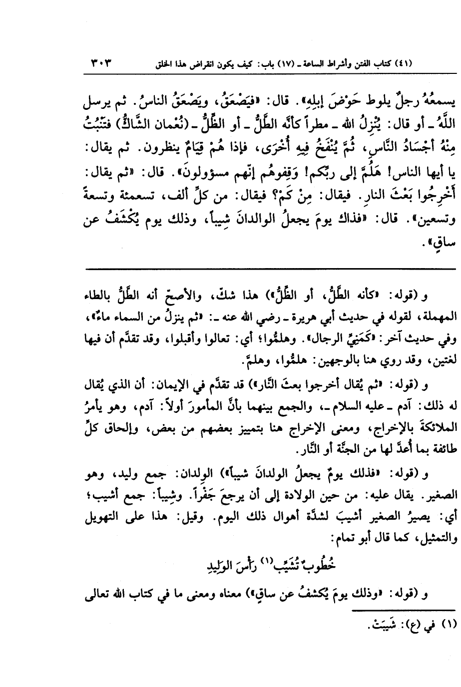 يَسمَعُهُ رَجُلٌ يَلُوطُ حَوضَ إِبِلِهِ قَالَ: فَيَصعَقُ وَيَصعَقُ النَّاسُ، ثُمَّ يُرسِلُ اللَّهُ - أَو قَالَ: يُنزِلُ اللَّهُ - مَطَرًا كَأَنَّهُ الطَّلُّ، أَو: الظِّلُّ - نُعمَانُ الشَّاكُّ - فَتَنبُتُ مِنهُ أَجسَادُ النَّاسِ، ثُمَّ يُنفَخُ فِيهِ أُخرَى، فَإِذَا هُم قِيَامٌ يَنظُرُونَ، ثُمَّ يُقَالُ: يَا أَيُّهَا النَّاسُ هَلُمَّ إِلَى رَبِّكُم، وَقِفُوهُم إِنَّهُم مَسئُولُونَ. قَالَ: ثُمَّ يُقَالُ: أَخرِجُوا بَعثَ النَّارِ، فَيُقَالُ: مِن كَم؟ فَيُقَالُ: مِن كُلِّ أَلفٍ تِسعمِائَةٍ وَتِسعَةً وَتِسعِينَ. قَالَ: فَذَاكَ يَومَ {يَجعَلُ الوِلدَانَ شِيبًا} وَذَلِكَ {يَومَ يُكشَفُ عَن سَاقٍ}