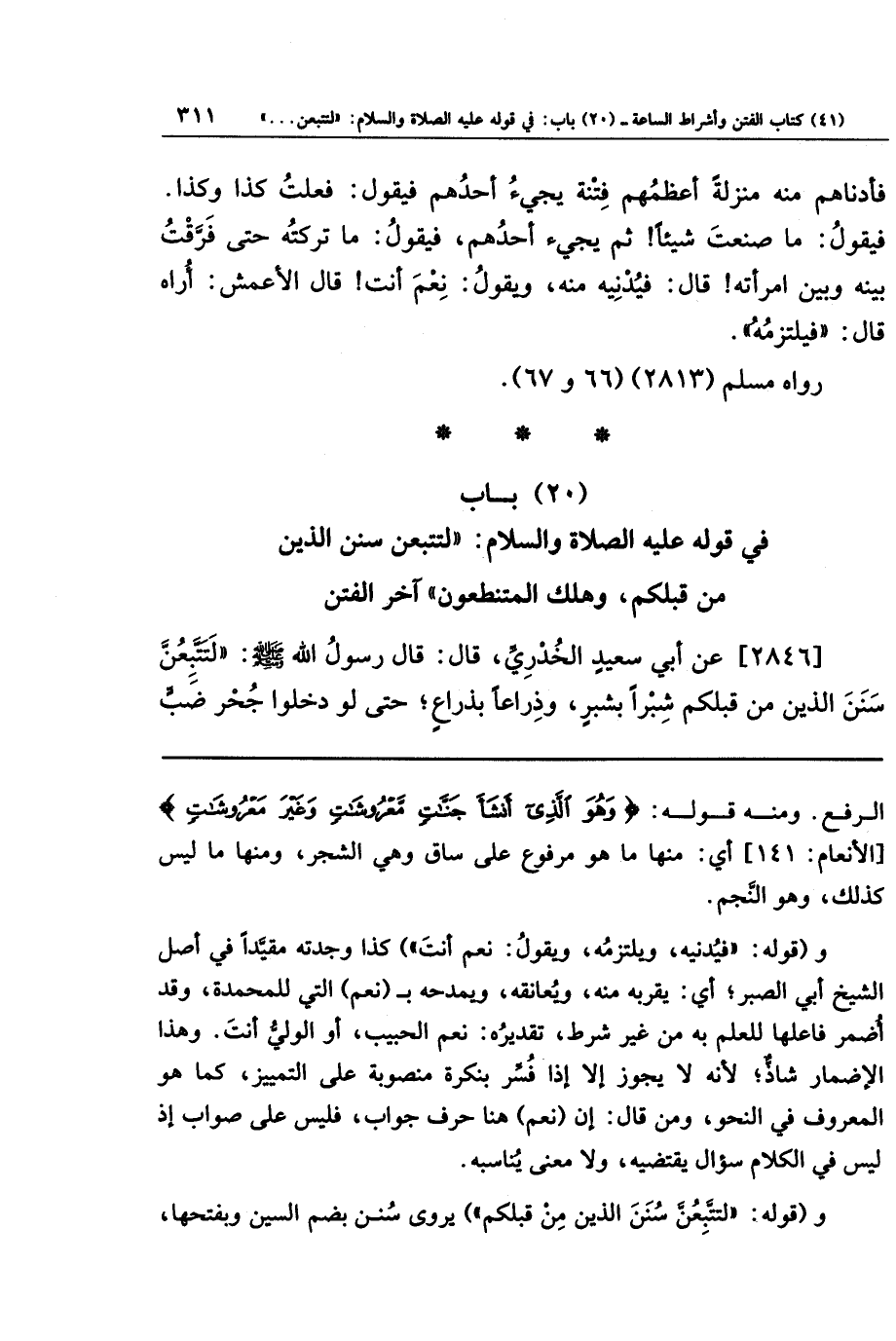 [2846] عن أبي سعيد الخدري قال: قال رسول الله صلى الله عليه وسلم: لتتبعن سنن الذين من قبلكم شبرا بشبر وذراعا بذراع، حتى لو دخلوا جحر ضب