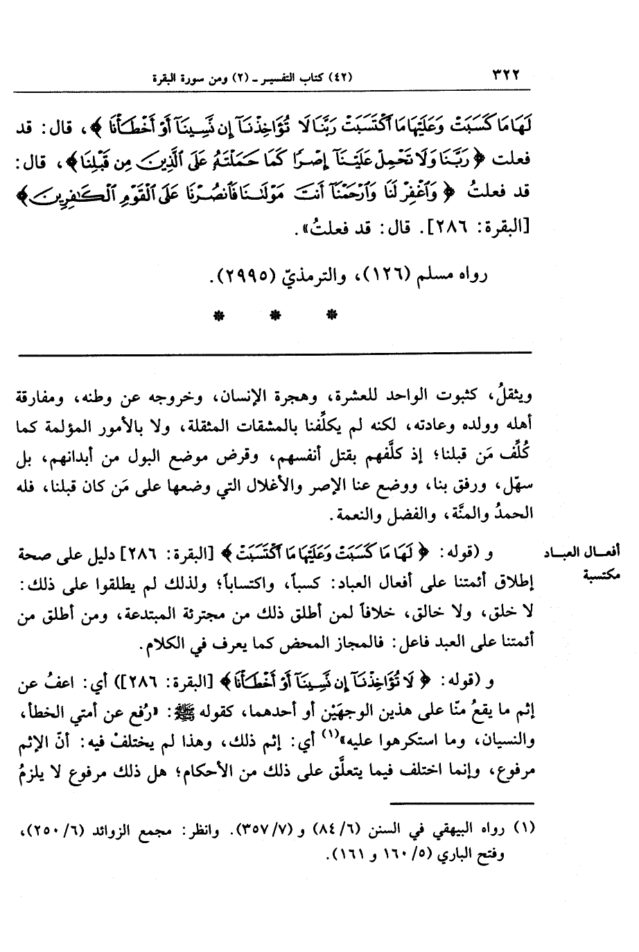 و(قوله: {لَهَا مَا كَسَبَت وَعَلَيهَا مَا اكتَسَبَت} دليل على صحة إطلاق أئمتنا على أفعال العباد: كسبا واكتسابا، ولذلك لم يطلقوا على ذلك: لا خلق، ولا خالق، خلافا لمن أطلق ذلك من مجترئة المبتدعة، ومن أطلق من أئمتنا على العبد فاعل، فالمجاز المحض، كما يعرف في الكلام.