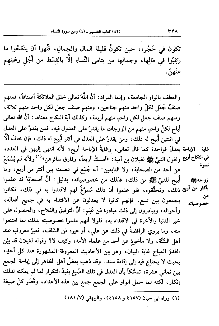 والعطف بالواو الجامعة، وإنما المراد أن الله تعالى خلق الملائكة أصنافا؛ فمنهم صنف جعل لكل واحد منهم جناحين، ومنهم صنف جعل لكل واحد منهم ثلاثة، ومنهم صنف جعل لكل واحد منهم أربعة، وكذلك آية النكاح معناها أن الله تعالى أباح لكل واحد منهم من الزوجات ما يقدر على العدول فيه، فمن يقدر على العدل في اثنتين أبيح له ذلك، ومن يقدر على العدل في أكثر أبيح له ذلك، فإن خاف ألا يعدل فواحدة كما قال تعالى، وغاية الإباحة أربع؛ لأنَّه انتهى إليهن في العدد، ولقول النبي صلى الله عليه وسلم لغيلان بن أمية: أمسك أربعا، وفارق سائرهن (¬1)، ولأنه لم يسمع عن أحد من الصحابة ولا التابعين أنه جمع في عصمته بين أكثر من أربع، وما أبيح للنبي صلى الله عليه وسلم من ذلك فذلك من خصوصياته بدليل أن أصحابه قد علموا ذلك وتحققوه، فلو علموا أن ذلك مسوَّغ لهم لاقتدوا به في ذلك فكانوا يجمعون بين تسع، فإنَّهم كانوا لا يعدلون عن الاقتداء به في جميع أفعاله وأحواله ويبادرون إلى ذلك مبادرة من علم أن التوفيق والفلاح والحصول على خير الدنيا والآخرة في الاقتداء به، فلولا أنهم علموا خصوصيته بذلك لما امتنعوا منه، وما يروي الرافضة في ذلك عن علي أو غيره من السلف فغير معروف عند أهل السنة ولا مأخوذ عن أحد من علماء الأمة، وكيف لا وقوله لغيلان قد بين القدر المباح غاية البيان، وهو من الأحاديث المعروفة المشهورة عند كل أحد بحيث لا يحتاج فيه إلى إقامة سند. وقد ذهب بعض أهل الظاهر إلى إباحة الجمع بين ثماني عشرة تمسُّكًا بأن العدل في تلك الصيغ يفيد التكرار لما لم يمكنه لذلك إنكار، لكنه لما حمل الواو على الجمع جمع بين هذه الأعداد وقصر كل صيغة