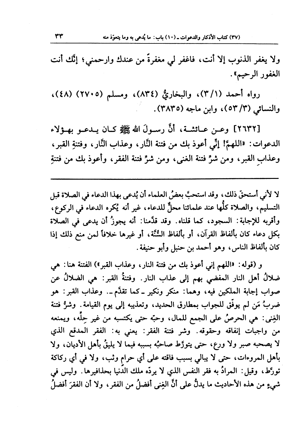[2632] وعن عائشة، أَنَّ رَسُولَ اللَّهِ صَلَّى اللَّهُ عَلَيهِ وَسَلَّمَ كَانَ يَدعُو بِهَؤُلَاءِ الدَّعَوَاتِ: اللَّهُمَّ إِنِّي أَعُوذُ بِكَ مِن فِتنَةِ النَّارِ وَعَذَابِ النَّارِ، وَفِتنَةِ القَبرِ وَعَذَابِ القَبرِ، وَمِن شَرِّ فِتنَةِ الغِنَى، وَمِن شَرِّ فِتنَةِ الفَقرِ، وَأَعُوذُ بِكَ مِن فِتنَةِ