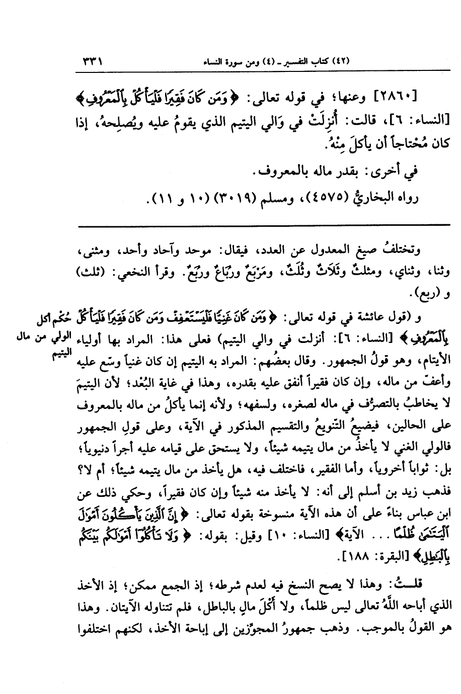 و(قول عائشة في قوله تعالى: {وَمَن كَانَ غَنِيًّا فَليَستَعفِف وَمَن كَانَ فَقِيرًا فَليَأكُل بِالمَعرُوفِ} أُنزلت في والي اليتيم)، فعلى هذا: المراد بها أولياء الأيتام، وهو قول الجمهور. وقال بعضهم: المراد به اليتيم؛ إن كان غنيا وسع عليه وأعف من ماله، وإن كان فقيرا أنفق عليه بقدره، وهذا في غاية البعد؛ لأنَّ اليتيم لا يخاطب بالتصرف في ماله لصغره ولسفهه، ولأنه إنما يأكل من ماله بالمعروف على الحالين، فيضيع التنويع والتقسيم المذكور في الآية، وعلى قول الجمهور فالولي الغني لا يأخذ من مال يتيمه شيئا ولا يستحق على قيامه عليه أجرا دنيويا؛ بل ثوابا أخرويا. وأما الفقير فاختلف فيه هل يأخذ من مال يتيمه شيئًا أم لا؟ فذهب زيد بن أسلم إلى أنه لا يأخذ منه شيئًا وإن كان فقيرا، وحكي ذلك عن ابن عباس بناء على أن هذه الآية منسوخة بقوله تعالى: {إِنَّ الَّذِينَ يَأكُلُونَ أَموَالَ اليَتَامَى ظُلمًا} الآية، وقيل: بقوله {وَلا تَأكُلُوا أَموَالَكُم بَينَكُم بِالبَاطِلِ}
