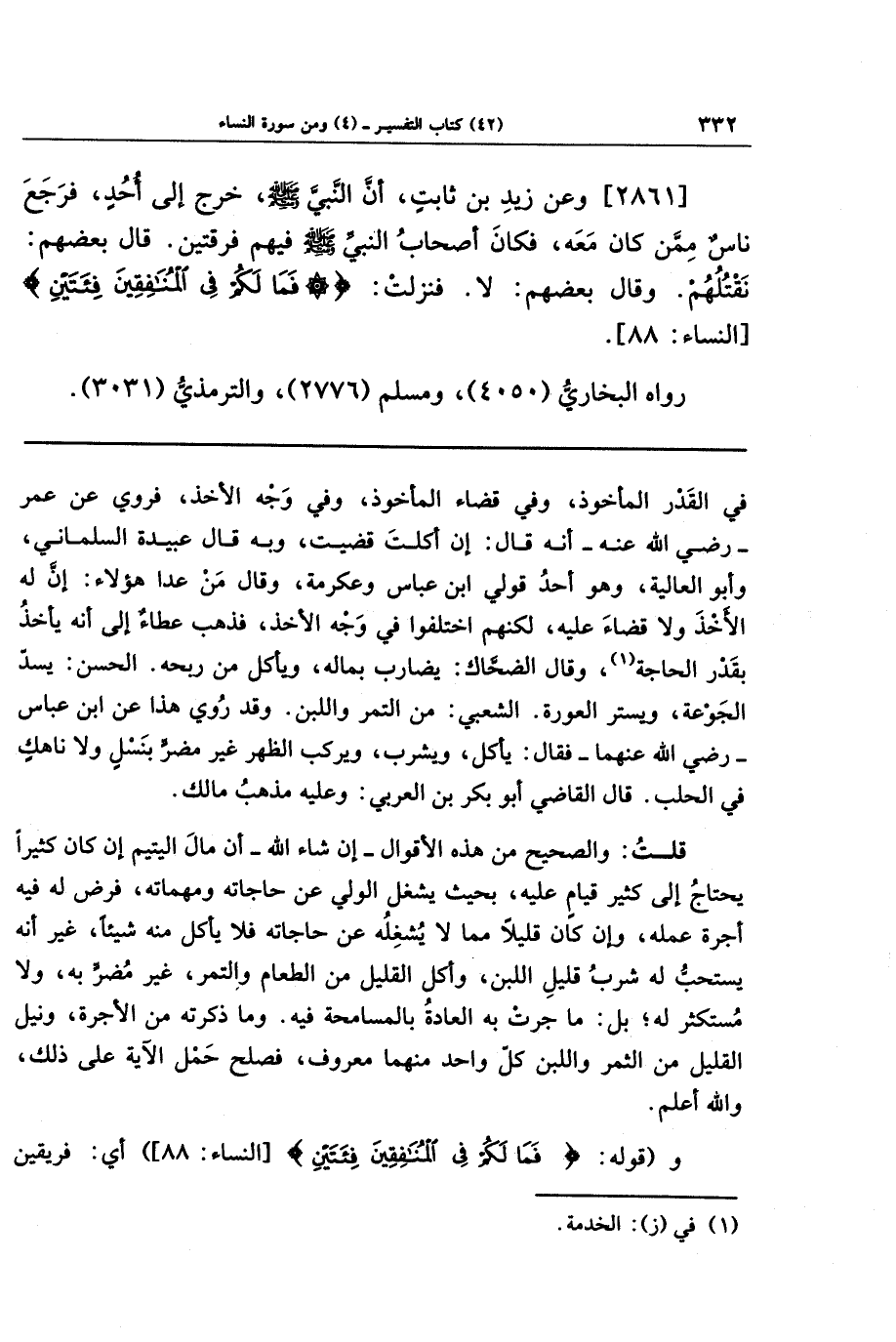 [2861] وعن زيد بن ثابت أن النبي صلى الله عليه وسلم خرج إلى أحد، فرجع ناس ممن كان معه، فكان أصحاب النبي صلى الله عليه وسلم فيهم فرقتين، قال بعضهم: نقتلهم. وقال بعضهم: لا. فنزلت: {فَمَا لَكُم فِي المُنَافِقِينَ فِئَتَينِ}