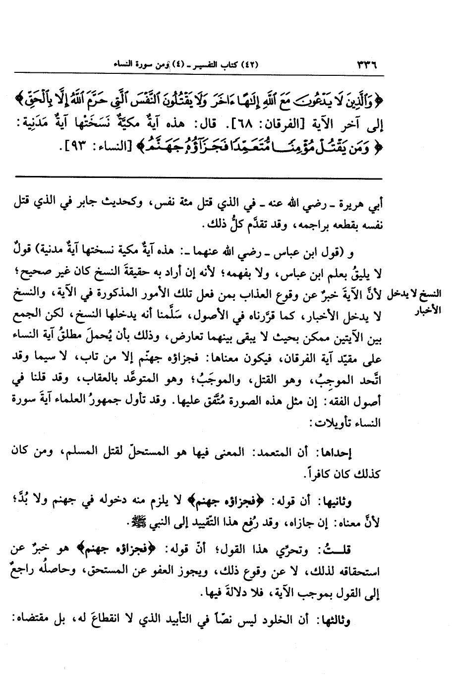 {وَالَّذِينَ لا يَدعُونَ مَعَ اللَّهِ إِلَهًا آخَرَ وَلا يَقتُلُونَ النَّفسَ الَّتِي حَرَّمَ اللَّهُ إِلا بِالحَقِّ} إِلَى آخِرِ الآيَةِ. قَالَ: هَذِهِ آيَةٌ مَكِّيَّةٌ نَسَخَتهَا آيَةٌ مَدَنِيَّةٌ: {وَمَن يَقتُل مُؤمِنًا مُتَعَمِّدًا فَجَزَاؤُهُ جَهَنَّمُ}