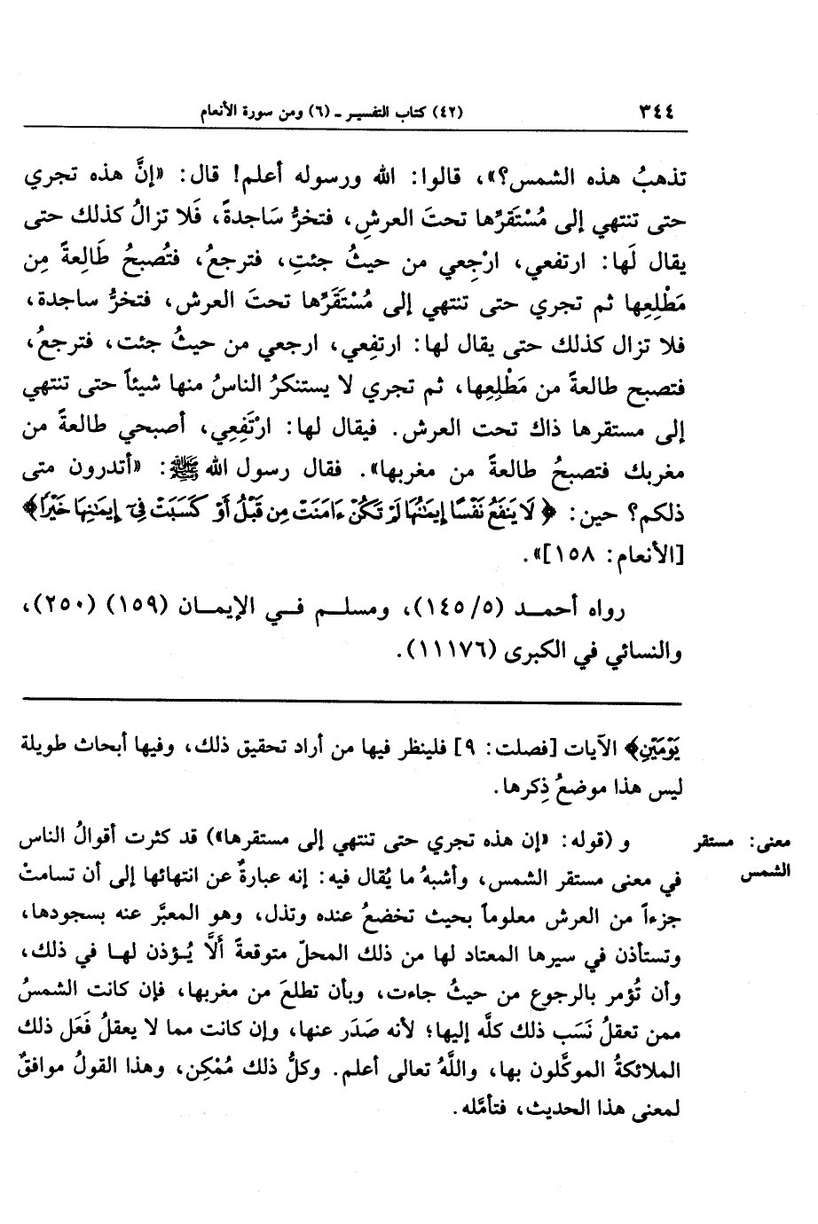 تَذهَبُ هَذِهِ الشَّمسُ؟ قَالُوا: اللَّهُ وَرَسُولُهُ أَعلَمُ! قَالَ: إِنَّ هَذِهِ تَجرِي حَتَّى تَنتَهِيَ إِلَى مُستَقَرِّهَا تَحتَ العَرشِ، فَتَخِرُّ سَاجِدَةً، فَلَا تَزَالُ كَذَلِكَ حَتَّى يُقَالَ لَهَا: ارتَفِعِي، ارجِعِي مِن حَيثُ جِئتِ! فَتَرجِعُ فَتُصبِحُ طَالِعَةً مِن مَطلِعِهَا، ثُمَّ تَجرِي حَتَّى تَنتَهِيَ إِلَى مُستَقَرِّهَا تَحتَ العَرشِ، فَتَخِرُّ سَاجِدَةً، فَلَا تَزَالُ كَذَلِكَ حَتَّى يُقَالَ لَهَا: ارتَفِعِي، ارجِعِي مِن حَيثُ جِئتِ! فَتَرجِعُ فَتُصبِحُ طَالِعَةً مِن مَطلِعِهَا، ثُمَّ تَجرِي لَا يَستَنكِرُ النَّاسَ مِنهَا شَيئًا، حَتَّى تَنتَهِيَ إِلَى مُستَقَرِّهَا ذَاكَ تَحتَ العَرشِ، فَيُقَالُ لَهَا: ارتَفِعِي، أَصبِحِي طَالِعَةً مِن مَغرِبِكِ! فَتُصبِحُ طَالِعَةً مِن مَغرِبِهَا. فَقَالَ رَسُولُ اللَّهِ صَلَّى اللَّهُ عَلَيهِ وَسَلَّمَ: أَتَدرُونَ مَتَى ذَلكُم؟ حِينَ {لا يَنفَعُ نَفسًا إِيمَانُهَا لَم تَكُن آمَنَت مِن قَبلُ أَو كَسَبَت فِي إِيمَانِهَا خَيرًا}