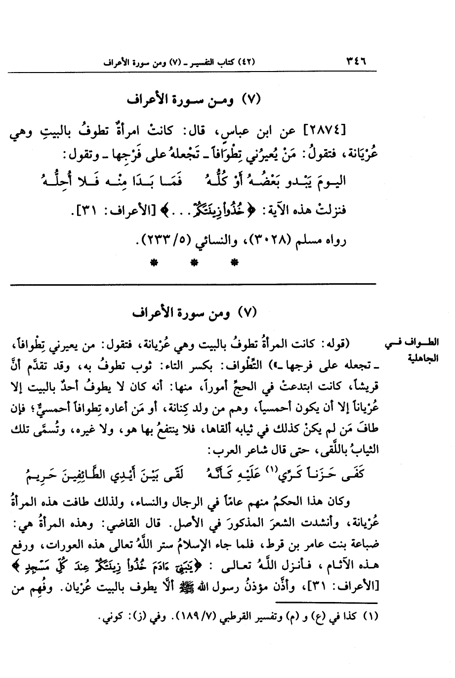 وكان هذا الحكم منهم عاما في الرجال والنساء، ولذلك طافت هذه المرأة عريانة وأنشدت الشعر المذكور في الأصل، قال القاضي: وهذه المرأة هي ضباعة بنت عامر بن قرط - فلما جاء الإسلام ستر الله تعالى هذه العورات ورفع هذه الآثام، فأنزل الله تعالى: {يَا بَنِي آدَمَ خُذُوا زِينَتَكُم عِندَ كُلِّ مَسجِدٍ} وأذن مؤذن رسول الله - صلى الله عليه وسلم - ألا يطوف بالبيت عريان، وفهم من