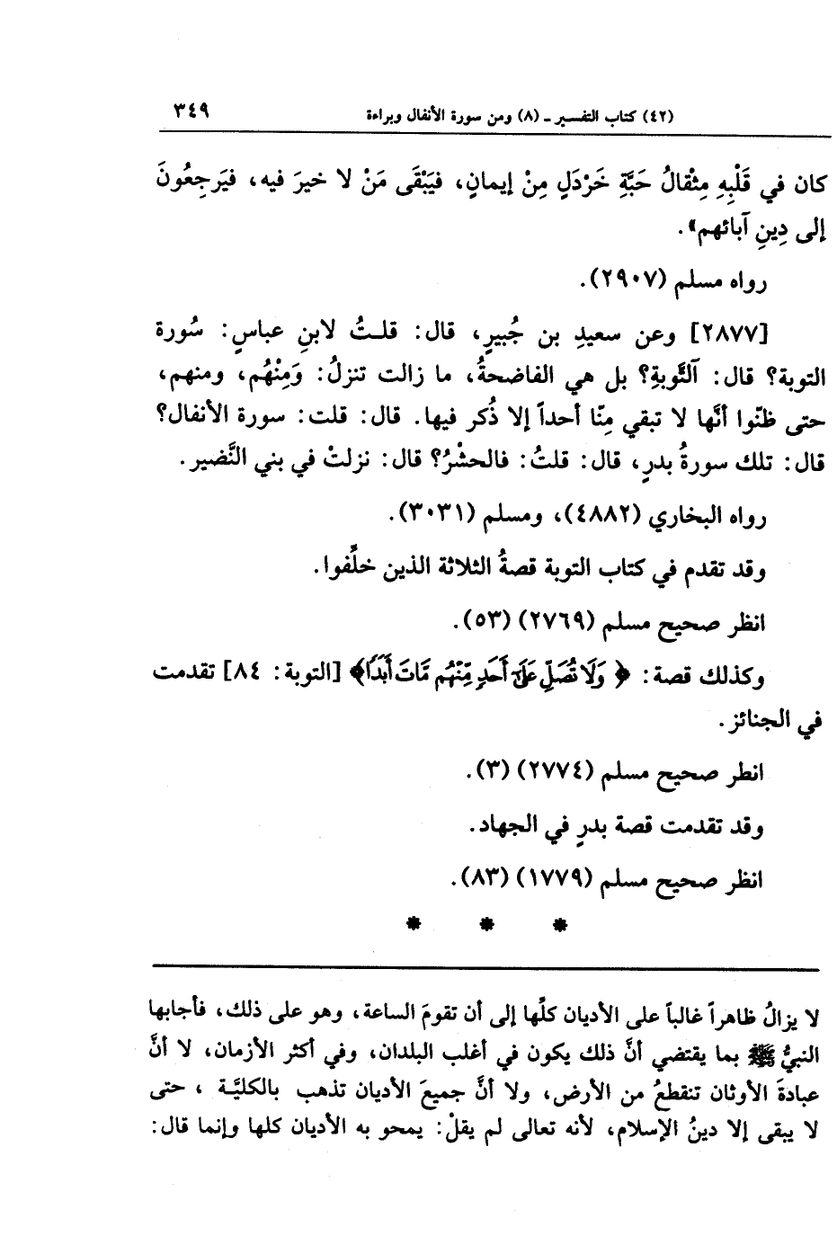 [2877] وعَن سَعِيدِ بنِ جُبَيرٍ قَالَ: قُلتُ لِابنِ عَبَّاسٍ: سُورَةُ التَّوبَةِ؟ قَالَ: آلتَّوبَةِ؟ بَل هِيَ الفَاضِحَةُ! مَا زَالَت تَنزِلُ: وَمِنهُم، وَمِنهُم - حَتَّى ظَنُّوا أَنها لَا تبقي مِنَّا أَحَدا إِلَّا ذُكِرَ فِيهَا. قَالَ: قُلتُ: سُورَةُ الأَنفَالِ؟ قَالَ: تِلكَ سُورَةُ بَدرٍ. قَالَ: قُلتُ: فَالحَشرُ؟ قَالَ: نَزَلَت فِي بَنِي النَّضِيرِ.