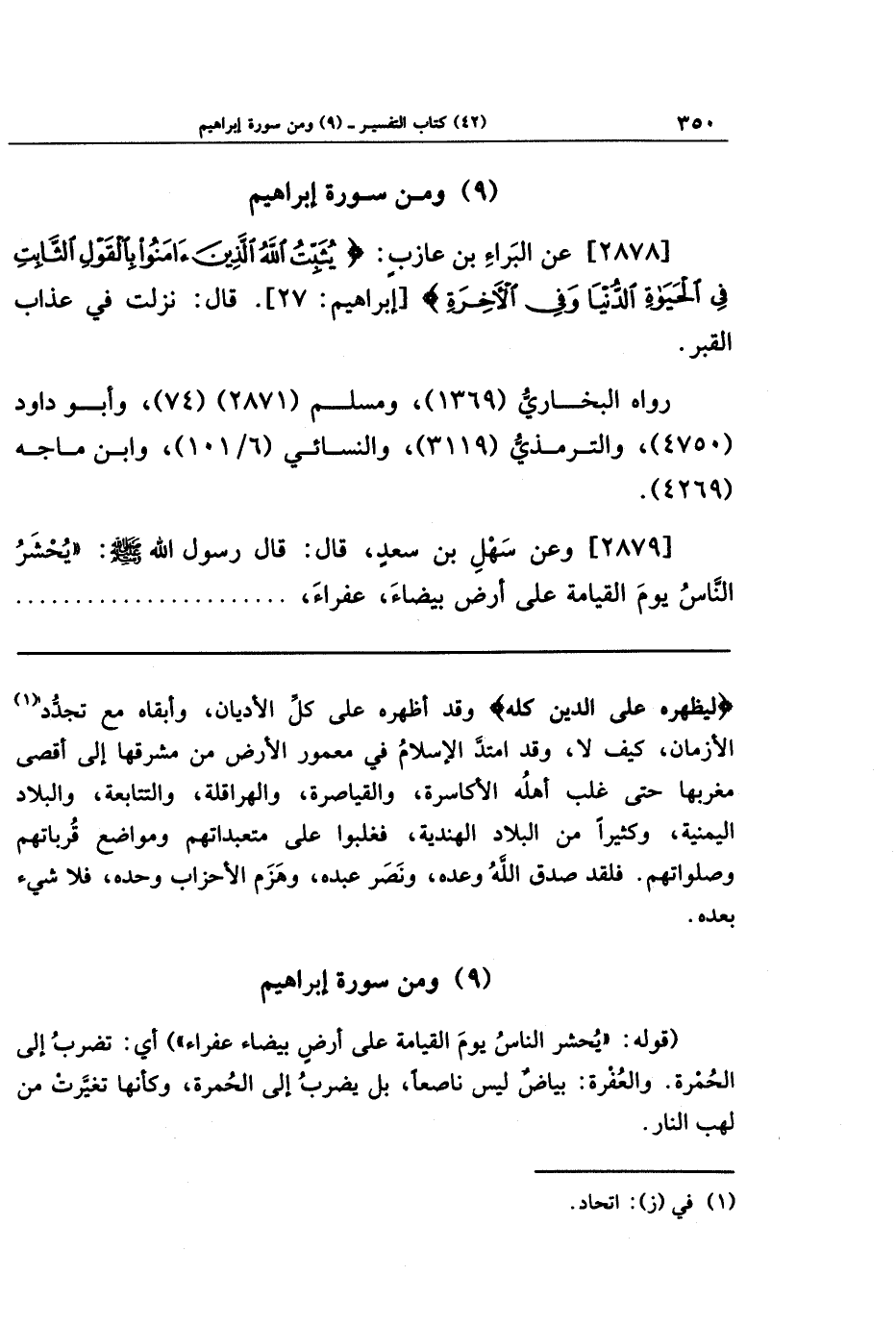 [2879] وعن سهل بن سعد قال: قال رسول الله صلى الله عليه وسلم: يُحشر الناس يوم القيامة على أرض بيضاء عفراء
