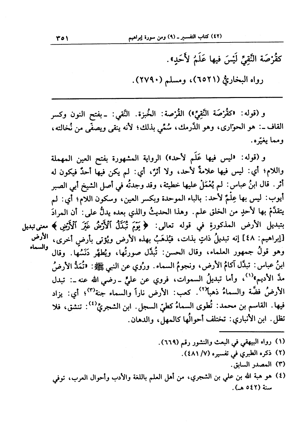 و(قوله ليس فيها علم لأحد)، الرواية المشهورة بفتح العين المهملة واللام؛ أي: ليس فيها علامة لأحد ولا أثر، أي لم يكن فيها أحد فيكون له أثر. قال ابن عباس: لم يعمل عليها خطيئة، وقد وجدته في أصل الشيخ أبي الصبر أيوب ليس بها عِلم لأحد بالباء الموحدة وبكسر العين وسكون اللام؛ أي: لم يتقدم بها لأحد من الخلق علم. وهذا الحديث والذي بعده يدل على أن المراد بتبديل الأرض المذكورة في قوله تعالى: {يَومَ تُبَدَّلُ الأَرضُ غَيرَ الأَرضِ} إنه تبديل ذات بذات، فيُذهب بهذه الأرض ويؤتى بأرض أخرى، وهو قول جمهور العلماء، وقال الحسن: تبدل صورتها ويطهر دنسها. وقال ابن عباس: تبدل آكام الأرض ونجوم السماء. وروي عن النبي صلى الله عليه وسلم: تُمَد الأرض مد الأديم (¬1)، وأما تبديل السماوات فروي عن علي رضي الله عنه: تبدل الأرض فضة والسماء ذهبا (¬2). كعب: الأرض نارا والسماء جنة (¬3) - أي: يُزاد فيها. القاسم بن محمد: تطوى السماء كطي السجل. ابن الشجري (¬4): تنشق فلا تظل. ابن الأنباري: تختلف أحوالها كالمهل والدهان.