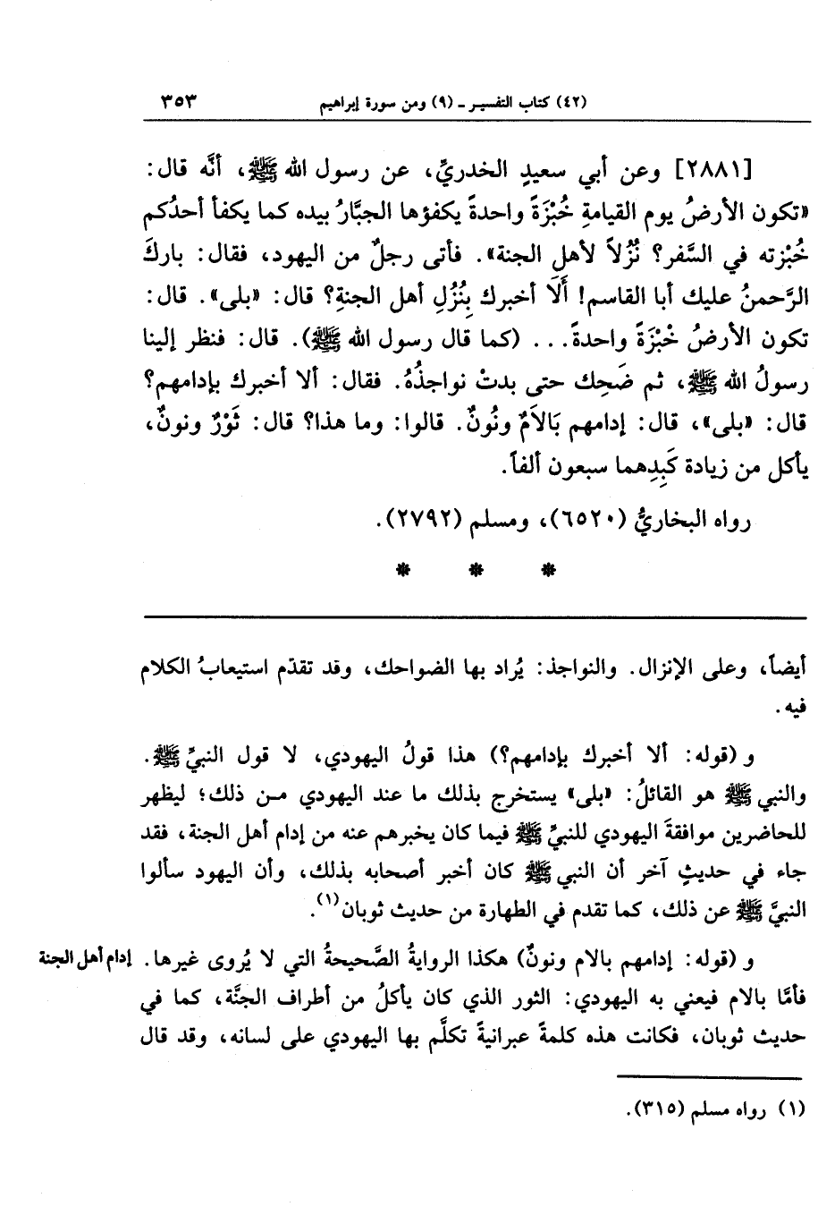 [2881] وعَن أَبِي سَعِيدٍ الخُدرِيِّ، عَن رَسُولِ اللَّهِ صَلَّى اللَّهُ عَلَيهِ وَسَلَّمَ أنه قَالَ: تَكُونُ الأَرضُ يَومَ القِيَامَةِ خُبزَةً وَاحِدَةً، يَكفَؤُهَا الجَبَّارُ بِيَدِهِ كَمَا يَكفَأُ أَحَدُكُم خُبزَتَهُ فِي السَّفَرِ، نُزُلًا لِأَهلِ الجَنَّةِ. فَأَتَى رَجُلٌ مِن اليَهُودِ فَقَالَ: بَارَكَ الرَّحمَنُ عَلَيكَ أَبَا القَاسِمِ! أَلَا أُخبِرُكَ بِنُزُلِ أَهلِ الجَنَّةِ؟ قَالَ: بَلَى. قَالَ: تَكُونُ الأَرضُ خُبزَةً وَاحِدَةً. . . (كَمَا قَالَ رَسُولُ اللَّهِ صَلَّى اللَّهُ عَلَيهِ وَسَلَّمَ)، قَالَ: فَنَظَرَ إِلَينَا رَسُولُ اللَّهِ صَلَّى اللَّهُ عَلَيهِ وَسَلَّمَ ثُمَّ ضَحِكَ حَتَّى بَدَت نَوَاجِذُهُ، فقَالَ: أَلَا أُخبِرُكَ بِإِدَامِهِم؟ قَالَ: بَلَى. قَالَ: إِدَامُهُم بَالَام وَنُونٌ. قَالُوا: وَمَا هَذَا؟ قَالَ: ثَورٌ وَنُونٌ، يَأكُلُ مِن زيادة كَبِدِهِمَا سَبعُونَ أَلفًا.