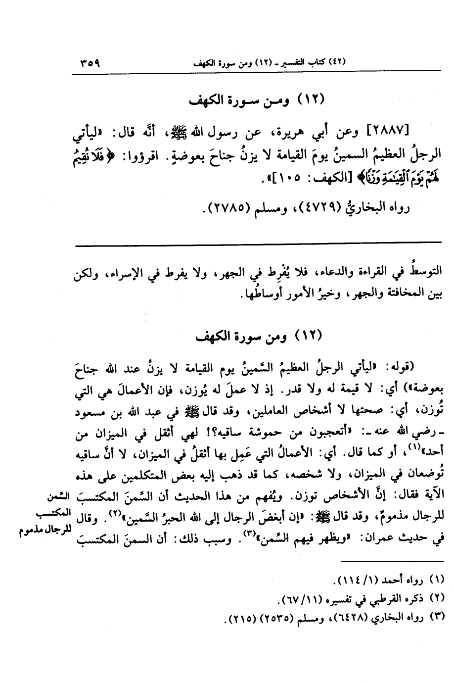 [2887] وعن أبي هريرة عن رسول الله صلى الله عليه وسلم أنه قال: ليأتي الرجل العظيم السمين يوم القيامة لا يزن جناح بعوضة! اقرؤوا: {فَلا نُقِيمُ لَهُم يَومَ القِيَامَةِ وَزنًا}.