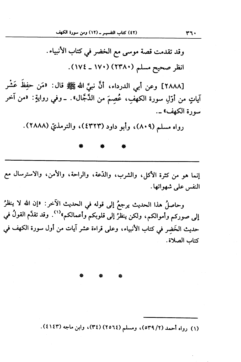 وحاصل هذا الحديث يرجع إلى قوله في الحديث الآخر إن الله لا ينظر إلى صوركم وأموالكم، ولكن ينظر إلى قلوبكم وأعمالكم (¬1)، وقد تقدَّم القول في حديث الخضر في كتاب الأنبياء وعلى قراءة عشر آيات من أول سورة الكهف في كتاب الصلاة.