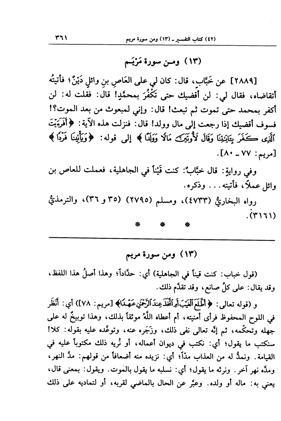 [2889] عن خباب قال: كان لي على العاص بن وائل دين، فأتيته أتقاضاه، فقال لي: لن أقضيك حتى تكفر بمحمد! قال: فقلت له: لن أكفر بمحمد حتى تموت ثم تبعث! قال: وإني لمبعوث من بعد الموت؟ فسوف أقضيك إذا رجعت إلى مال وولد! قال: فنزلت هذه الآية: {أَفَرَأَيتَ الَّذِي كَفَرَ بِآيَاتِنَا وَقَالَ لأُوتَيَنَّ مَالا وَوَلَدًا} إلى قوله: {وَيَأتِينَا فَردًا}