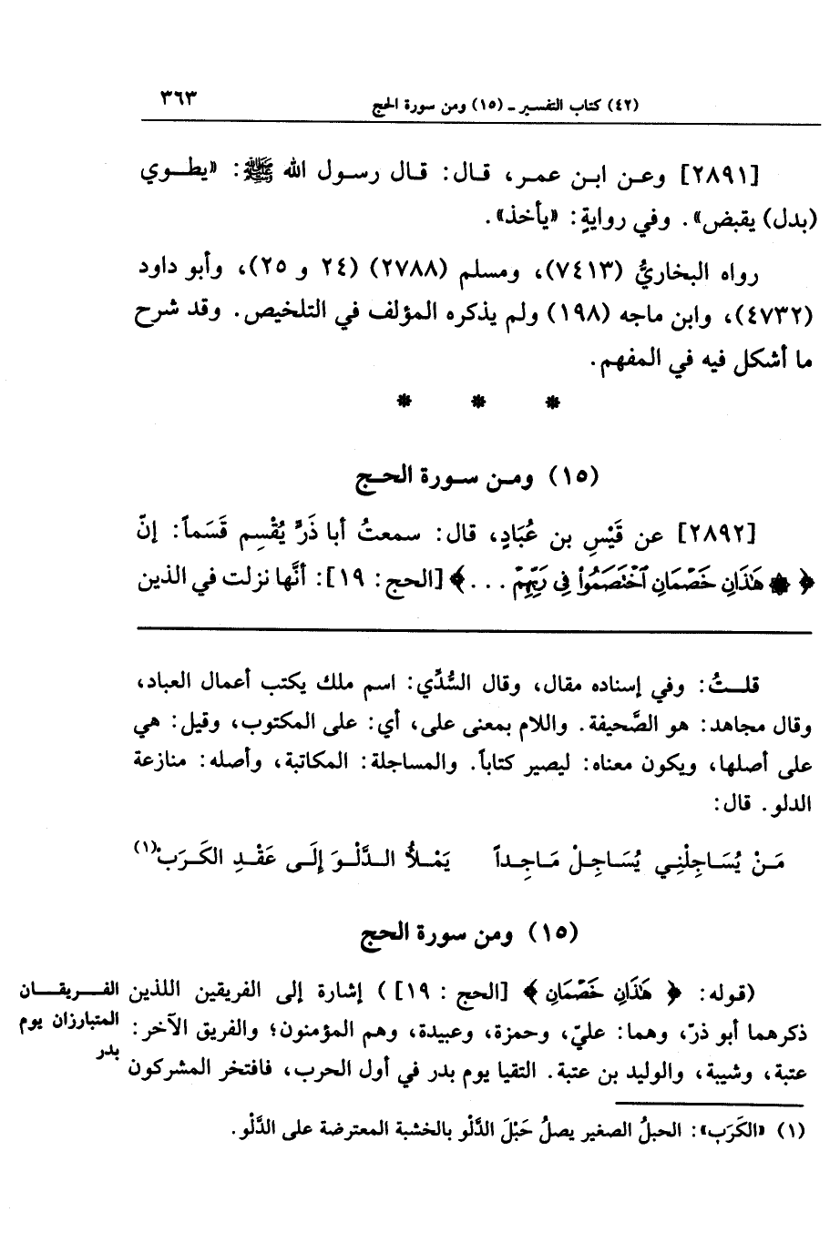 [2892] عن قيس بن عباد قال: سمعت أبا ذر يقسم قسما: إن {هَذَانِ خَصمَانِ اختَصَمُوا فِي رَبِّهِم} أنها نزلت في الذين