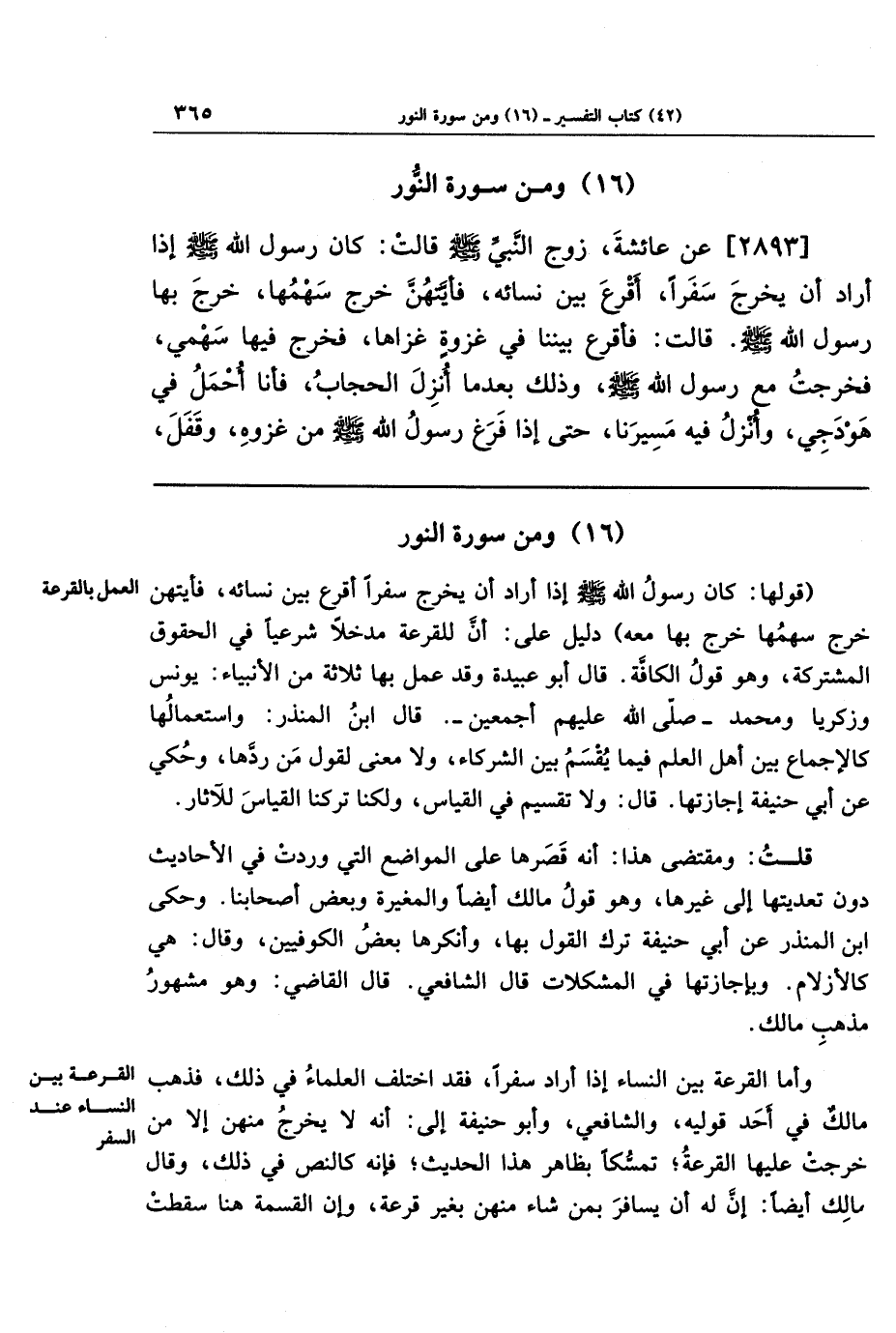 وأما القرعة بين النساء إذا أراد سفرا فقد اختلف العلماء في ذلك؛ فذهب مالك في أحد قوليه والشافعي وأبو حنيفة إلى أنه لا يخرج منهن إلا من خرجت عليها القرعة تمسُّكًا بظاهر هذا الحديث فإنه كالنص في ذلك، وقال مالك أيضًا: إن له أن يسافر بمن شاء منهن بغير قرعة وإن القسمة هنا سقطت